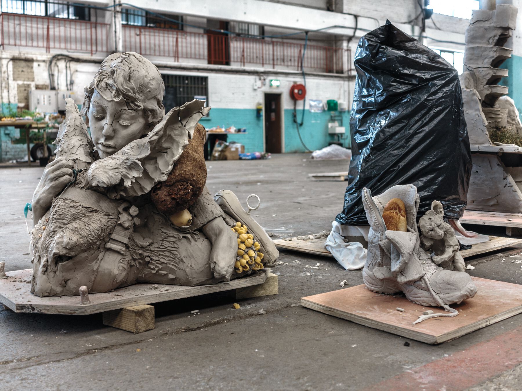 A pair of pliers suddenly disappears and reappears lodged in a sculpture at another station, almost like an act of vandalism, and sparks a new logic in the pieces. The studio enters directly into the final product as metonymy (a tool becomes part of the object, sticking to it like a mushroom on a humid surface). The borders between workstations, supplies, materials, waste, people, and “artwork” blur without disappearing, but stretch in their capacity to offer certainty and order. The situation becomes barely tolerable. The system tries to immunize itself; there is contact and friction; there are attempts to expel the foreign object. Where there is life, there is the struggle for survival, but also cooperation, dialogue, politics. Brick Farm questions, using the discourse of a psychotic person or an analyst. For this intrusive character, the stations become plots of land displaying a twisted agriculture of symbols that, through the living matter, continue with their unpredictable contortions.