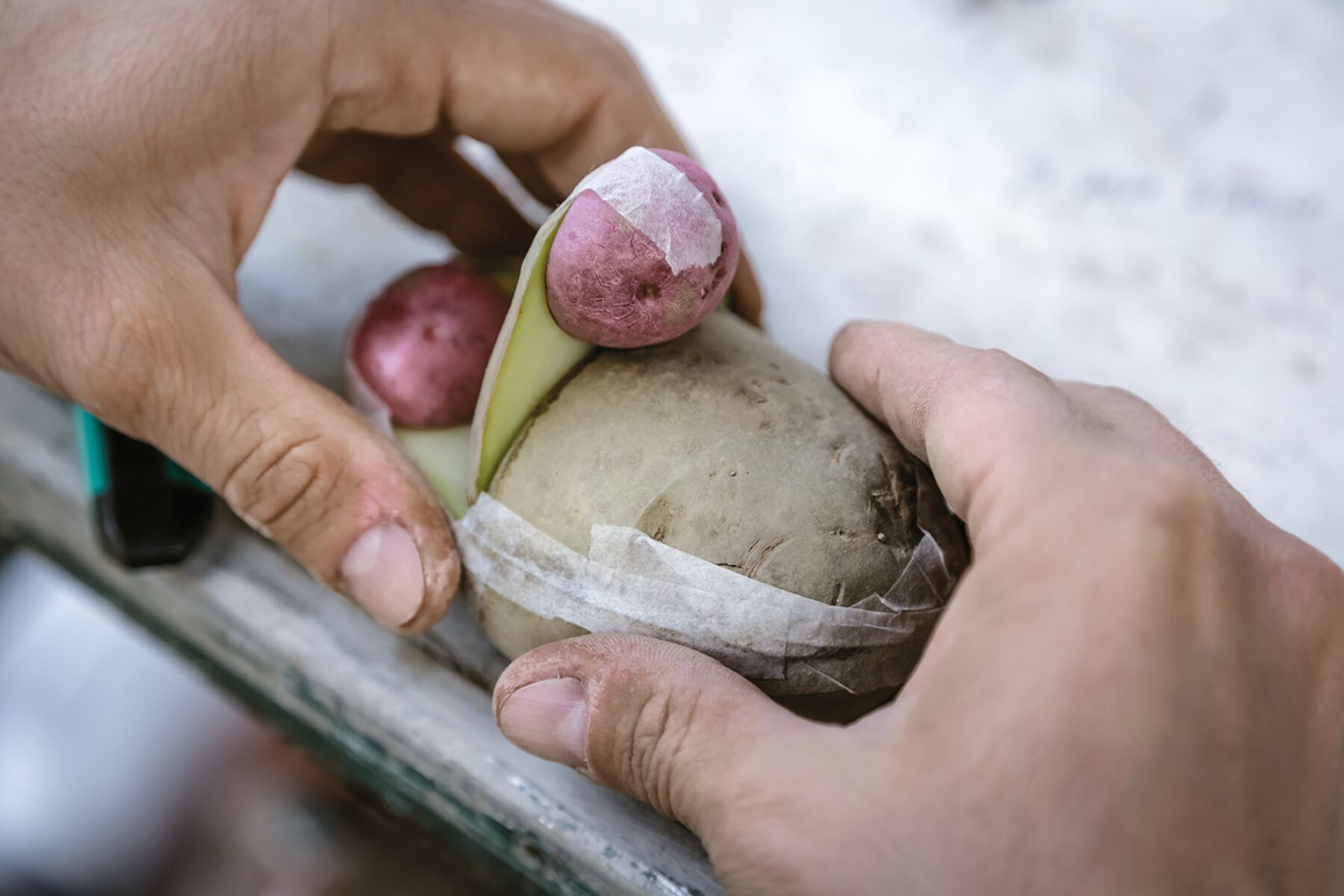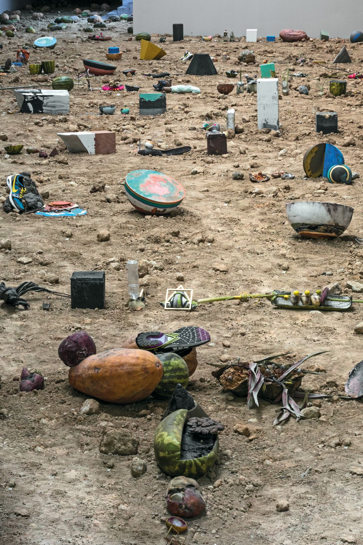 Everything in Los teatros de Saturno stems from the ecosystem where the project develops. Even the volcanic soil (tezontle) covering the floor is the result of an intense exploration of the region’s possibilities. We visit quarries, sand plants, and horticultural areas like Colonia San Gregorio Atlapulco, where we have access to an artisanal potato plot that will serve as the model to design the ground floor at kurimanzutto (the field of tezontle planted with mutants) (fig. 0.15). The local markets provide the materials that will be the biological basis for the hybrids, from tubers and flowers to crustaceans and fish. The local culture provides the poetics for the project: soil and color spontaneously emerge, with the latter returning after a six-year absence in the form of pigmented plaster. Through dialogues with producers, merchants, neighbors, and other key actors in the process, local lore and history provide the information and the images that bring specificity to the project.
