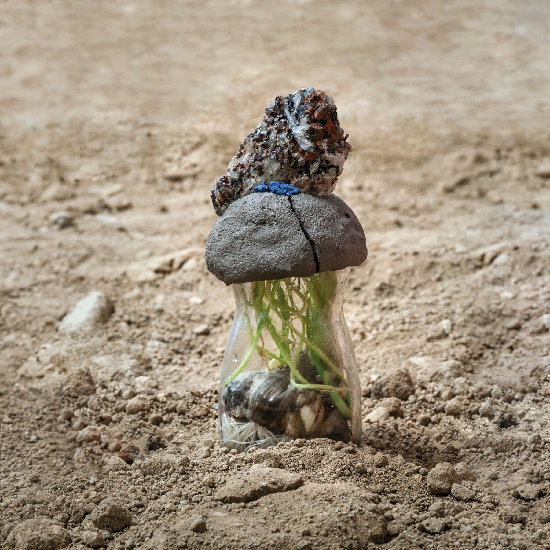 From that moment on, I communicate with Brick Farm through a continuous exchange of emails. We reflect, ramble, and share impressions about his botanical and horticultural experiments. He is taking his search in the landscape for “things” even deeper, from trash, knickknacks, textiles, and other industrial items to vegetables, tubers, fruit, edible animals, seeds, flowers, legumes, and plants. He grafts beans onto a watermelon, fills it with clay, plants it in the backyard of the house. He buys a shoe, fills it with dirt, plants sunflower or flax seeds, and inserts a chicken liver. He is completely obsessive. He photographs everything he is doing and writes about it cryptically, almost illegibly, in his accounts sent via email, which I respond to in an utterly natural way.
