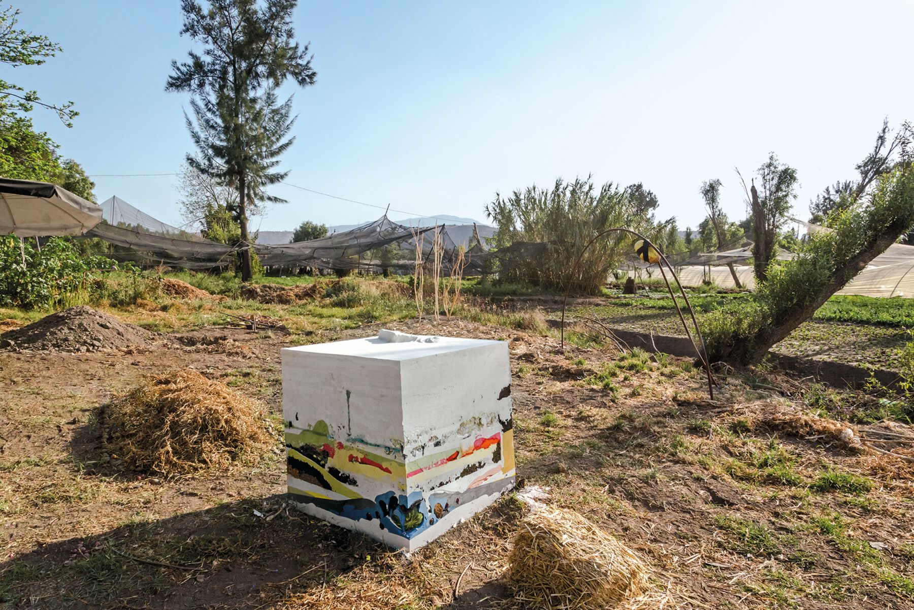 Geography, especially in Xochimilco, provides the territory to carry out a Mexican Brick Farm, and through it a dynamic of immersion in the topographical features of the environment. So powerful is the force that the landscape exerts on our senses—the diversity of the crops, of techniques, of species, of layers of sediment on the edges of the canals, of life fermenting within life—that the mutants become literally chronotopic (time-space) crystallizations, surfaces to absorb everything that surrounds us, like a screenshot of a dream, given the extreme metaphorical-metonymic concentration of these living entities. That is the case with those stratified cubes made of pigmented plaster, clay, and compost, which were born as a kind of multidimensional snapshot of Xochimilco. They are a material emulsion of our commitment with the site, the result of a state of interpenetration with the context, evidence in motion (since those cubes will remain at Eco Flor and be photographed in their diachronic transformation) of a fleeting present in a specific spot of the planet.