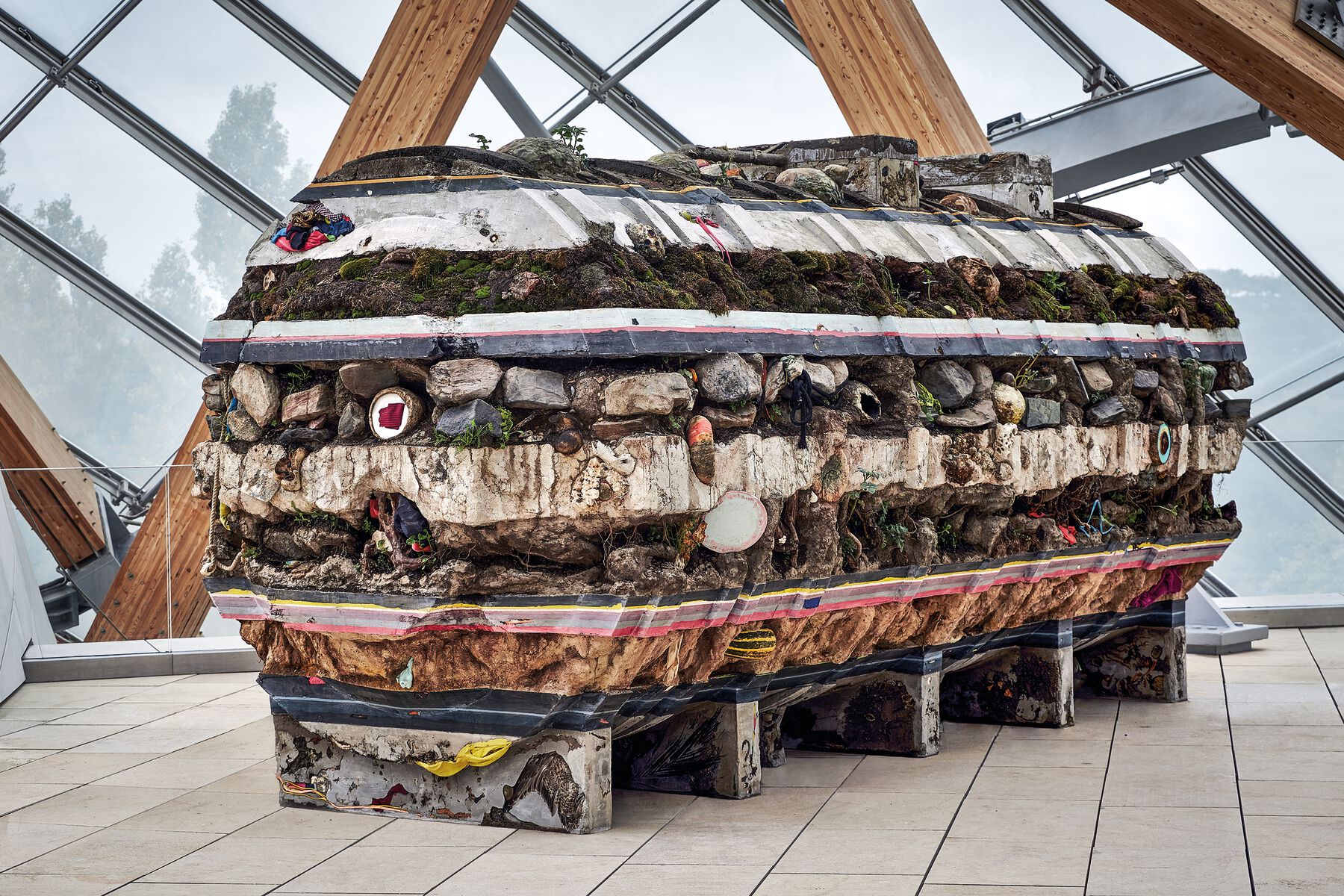 Inspired by the Xochimilco cubes, The Evolution of God and Where the Slaves Live are a “pictorial” homage to the change taking place in Mexico, where I set out to design, draw, and paint in 3D using the resources and techniques acquired in Los teatros de Saturno. In a way, this homage is a statement in which we lay out the rhetoric of a new poetics touched by that Mexican experience. This is why both projects enact a formalist play with stratification, the pigmented layers of sediment, the organic, the vegetation, blended with industrial detritus (sandals, textiles, ropes, bottles, personal items belonging to the team), which appear trapped in the mixture and which will lead various readers to see a metaphor with the Capitalocene. Both the “cube” in New York and the “tank” in Paris (fig. 0.16) are entities that replicate that autism of the early clay period (they are in some measure alien in the contexts where they are installed). But, like the project in Mexico, they return to the range of colors, materials, and elements of the Petrobras table, that map of maps where the dynamic of absorption of the environment was already implicit, on a scale appropriate to the period in which it was produced: everything that was used for the table was acquired through a process of exploring the commercial wholesale neighborhood of Rosario.