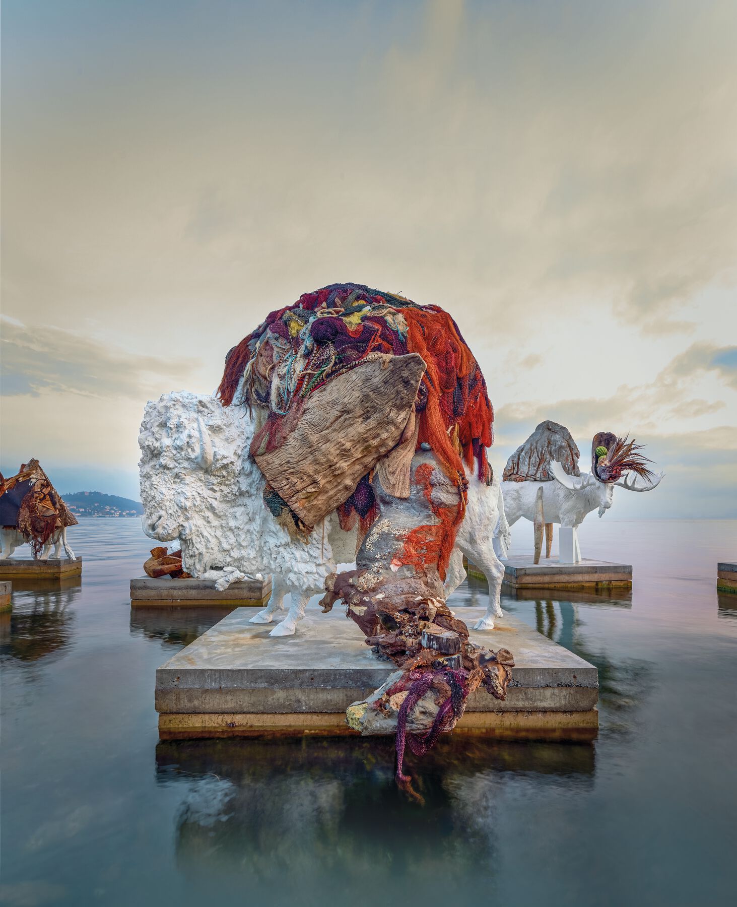The Most Beautiful of All Mothers (2015) and Rinascimento (Renaissance, 2015) are associated projects and represent a turning point in two issues: the connection with the environment and how to navigate the transition from one experience to another in a very short period of time, in terms of both the transportation of vernacular materials and the transfer of collective residual energy from one project/point on the planet to another.13 The Most Beautiful of All Mothers is a large-scale sculptural and aquatic installation (executed at sea) combining animals in a disorienting, absurd, or illogical way, for instance using some pieces as pedestals for others (fig. 0.17). Elements are also introduced that have been collected around the site, or from the store of transported materials or derived from the studio activities themselves that are unfolding in situ. The list includes fishing nets, livestock, scrap, clay, residue, minerals, and vegetation. It is a montage that makes use of the landscape as a kind of stage set, since these animals are installed on cement bases in the water, alongside the house where Leon Trotsky lived during the first three years of his Stalinist exile (1929–33) on the island of Büyükada in the Sea of Marmara facing Istanbul. The project demands very intense physical commitment, given, for example, the need to swim at night from one sculpture to the other to finish smoothing the cement at the bases and add finishing touches. It is a phenomenally transformative experience for us. Small sea snails soon appear on the parts exposed to saltwater, which triggers a fundamental question for me: What if this play of platforms, of animals holding up animals, has all of these tiny mollusks as the ultimate ending? What if this is only there for them to use?