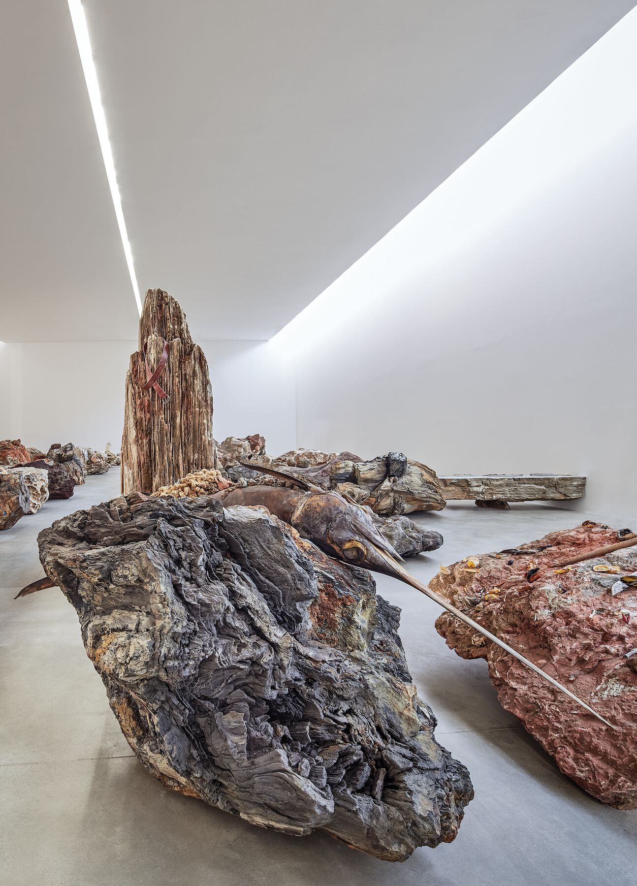 The use of blue screens as a leitmotif and framework for the objects presented at MOCA signals this white noise that Hollywood film has become, where the actors, connected to mobile sensors, isolated from their environment and above all from other actorly connections, perform a series of disconnected movements in front of a neutral backdrop, which will later be hyper-processed in a render farm somewhere in South Asia, where they will be virtually transformed into video game characters who become the real stars of the movie. Like actors with no future, submissive to whatever may come, the “things” presented against the blue screens in the central spaces of the museum not only absorb the myriad elements collected in the very intense months-long explorations I made in California’s “innovative milieu” and leafy stores of cinematographic junk; they also incorporate the remains of earlier projects and vernacular materials, gathered over years, stored in rental warehouses and brought from various corners of the planet, involving the largest logistical operation to date in my practice. Stones from Turkey, wood from Turin, marble from Morocco, flora and fauna from Mexico and Argentina, stratified columns, and even a bicycle wheel found along the shore in Sharjah all arrive in Los Angeles to blend alchemically with the organic and industrialized local materials (fig. 0.30). An enormous polymorphous mutant, a Leviathan project, rises up on the West Coast of the United States.