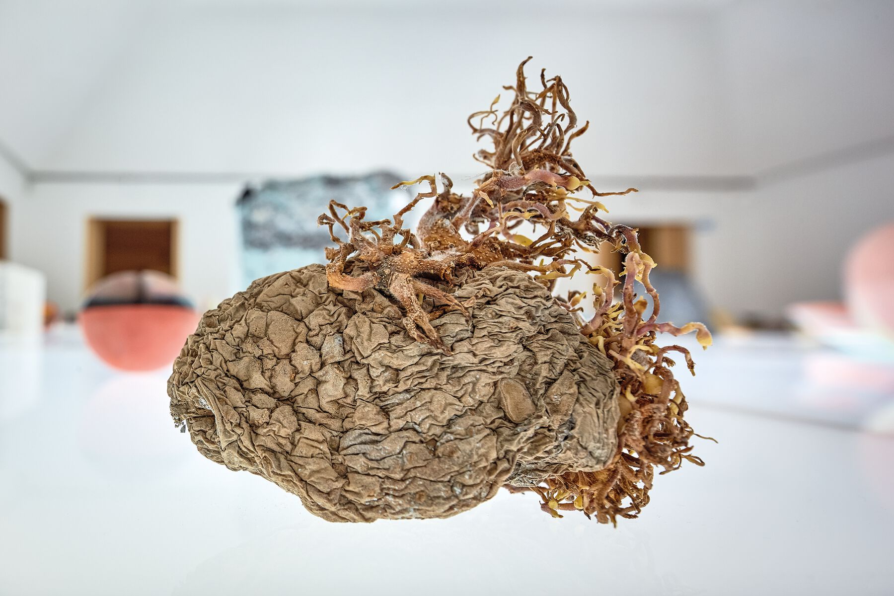 That is how a line of inquiry in my practice matured—one that was sustained from the beginning but is now very clearly defined. Human agency is replaced in favor of other agencies (bacteria, mushrooms, insects, climate, seasons, reproduction, growth, decomposition) that employ time to exert their influence to shape things. From the museological paradigm of protecting “things” against the passage of time, we move toward “things” that are “beings in time,” with pasts, presents, and projected futures, auto-produced but also conditioned by contextual variables. Thus, the institutions that house these mutants take on a central role. The hybrid’s “quality of life” depends on their control and monitoring, their care and interest, in conjunction with oversight by my office.