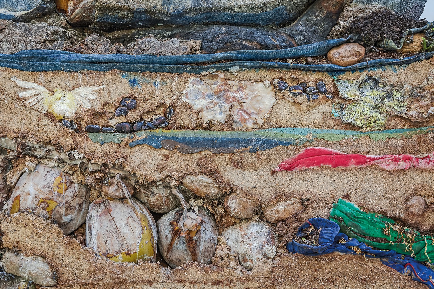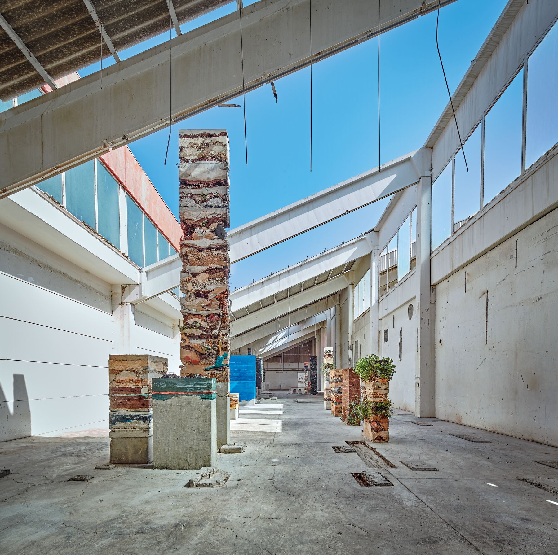 In Planetarium (fig. 0.24,fig. 0.25), we clean, refurbish, and redesign an abandoned ice factory on the outskirts of the town of Kalba, on the edge of the Persian Gulf, in order to install a series of stratified columns made of pigmented plaster, clay, cement, compost, and organic and industrial products in that deconstructed space. These columns are directly derived from the Xochimilco “cubes,” both formally and technically, and in their function of chronotopic (time-space) crystallization. In addition to incorporating materials transported from other parts of the planet, like Xochimilco and the Brick Farm in Rosario, the components are brought together after an intense process of exploration and collecting in the Sharjah region. Indeed, it is this multidimensional immersion in the Emirate territory—involving geographic, socioeconomic, cultural, and human aspects—and the resulting interactions with a network of local contacts, that give me access to the Kalba waste treatment plant. This state-owned company, created to process the growing amount of garbage resulting from the region’s economic and demographic boom, is producing black dirt through a composting process for local agricultural use. One ton of this composted soil becomes a part of the landscape created with the ice factory, arranged into six mounds that encapsulate the expansion of the Capitalocene fertile frontier over the desert, based on the treatment of its own organic residue. Everything in Planetarium, as a system to absorb the environment or chronotopic crystallizer, suggests this anthropogenic conquest of the desert.