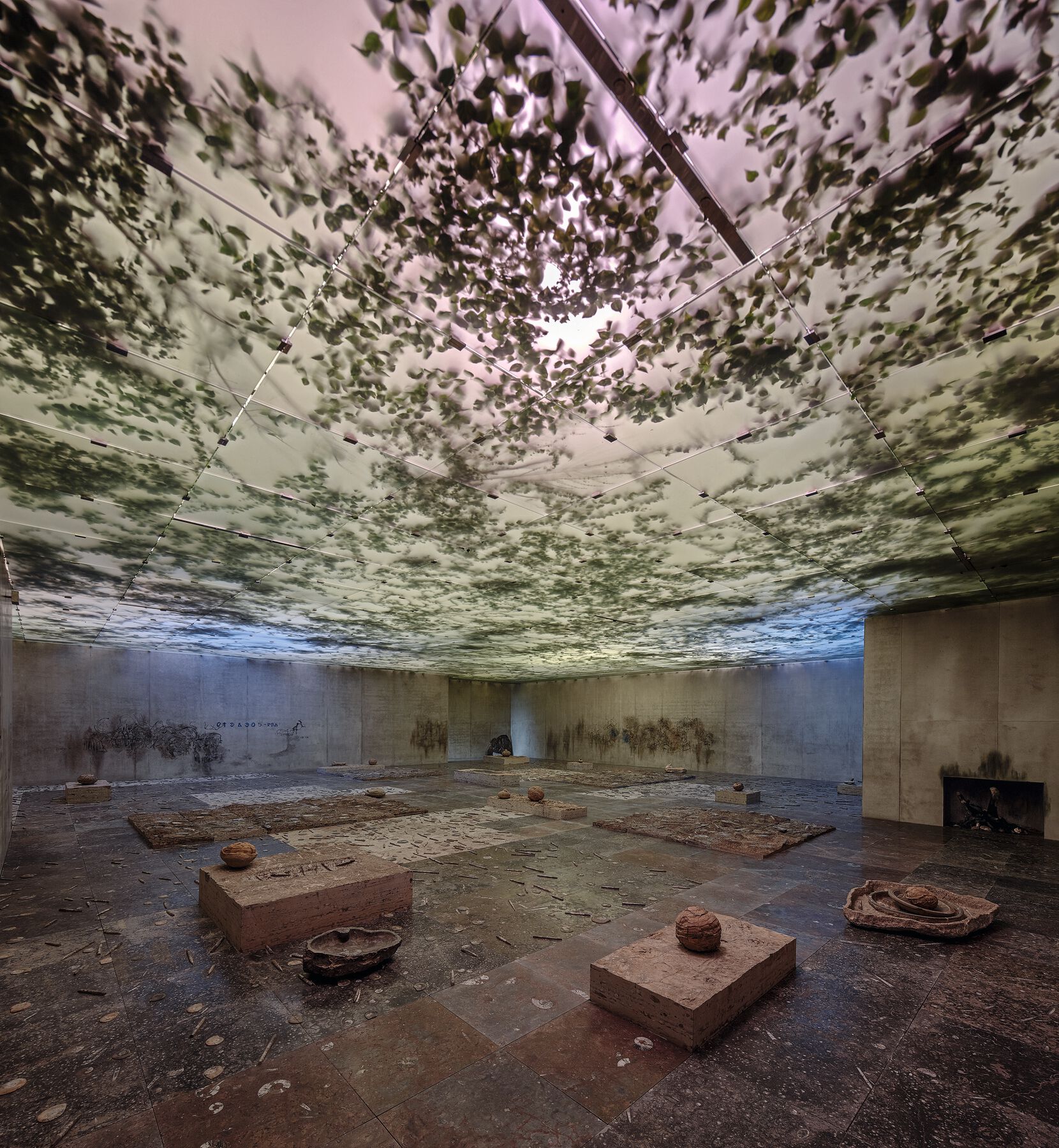 The “tank” in Where the Slaves Live at Fondation Louis Vuitton in Paris is an example of the new institutional approach stimulated by this mutant dynamic. Its organic components and the growth of its vegetation require constant monitoring and exchange of information with my office, as well as daily gardening maintenance such as pruning, watering, et cetera, in order to keep its autopoietic drift under control. This is also the case with Motherland (2015) at the Guggenheim in New York, where I create a poetic gesture based on the institutional actions generated by taking care of the diachronic object. It is at once an eternal project and an incognito one on the building’s roof, a place inaccessible to visitors and only made visible by an annual “ritual” on the same day at the same time: a designated maintenance staff member goes up to the rooftop, walks around the walkway that circles the glass cupola of the rotunda, and opens a small square in the mesh ultraviolet filter that covers it, letting natural light through that opening into the museum for one hour. This ritual is not announced publicly, but instead is seen as an ordinary task, performed without any “artistic” sense. Installed next to the heating equipment in a corner of the rooftop is a small sparrow made of clay, viscera, twigs, and weeds. Its permanent exposure to the atmosphere means that it must be replaced at intervals established by the museum and my office, based on observation. Both the ritual and the object will be replicated under the same protocols until the institution is permanently closed in some distant or nonexistent future. Both dimensions of living matter that I am trying to grasp in this article (the interaction between human and nonhuman agency, between work and auto-production, and one could now add a third element: environment) are poeticized here in a silent system of material and performative gestures.