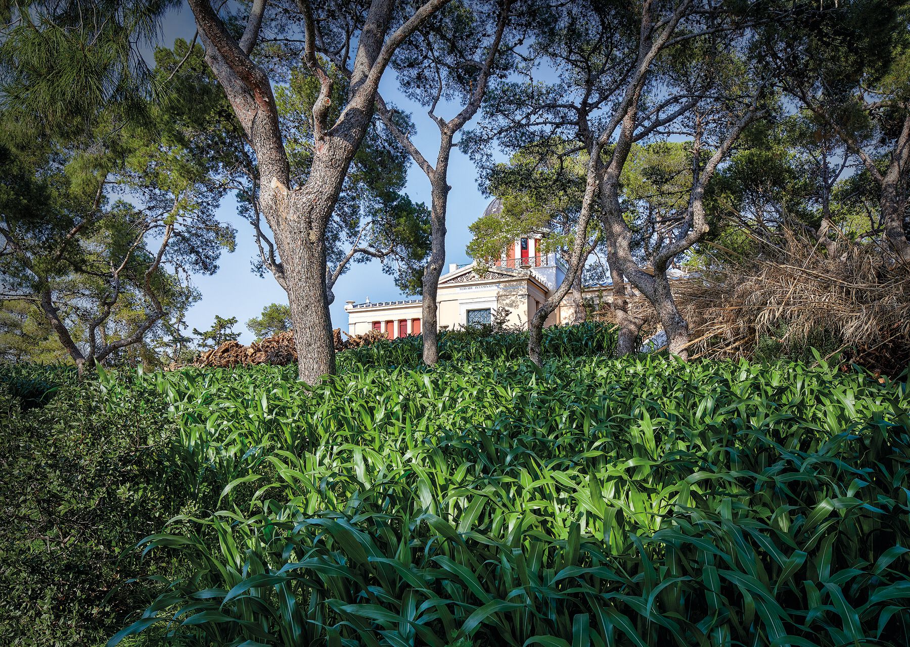In Greece, the National Observatory of Athens is the ideal setting for imagining the conquest of other planets from a disputed territory, no longer through war but symbolically. It is one of the premier scientific institutions in a country considered the cradle of Western civilization, but also a region that exists as a liminal zone between the Muslim East and the Christian West, recovered for “Europe” in 1832 after almost four hundred years of Turkish rule. Meanwhile, there in Athens, the nation’s historical identity and memory is defined by decisions made by the archaeological institutions regarding how deep to excavate to look for the “past”—which layers of earth to remove. Thus, reformulating the observatory’s exterior space, which is located on one of the seven Nymphs’ Hills where Athens is situated, and transforming it into a field of grasses (after obtaining complicated permits from the local archaeological authorities), as well as corn (an American crop), introduces the play of chronotopic juxtapositions addressing the problem of the appropriation of the ground, what lies beneath it or on top of it, by different countries, regions, and civilizations, with relation to the development of their economies and their identities (fig. 0.27).