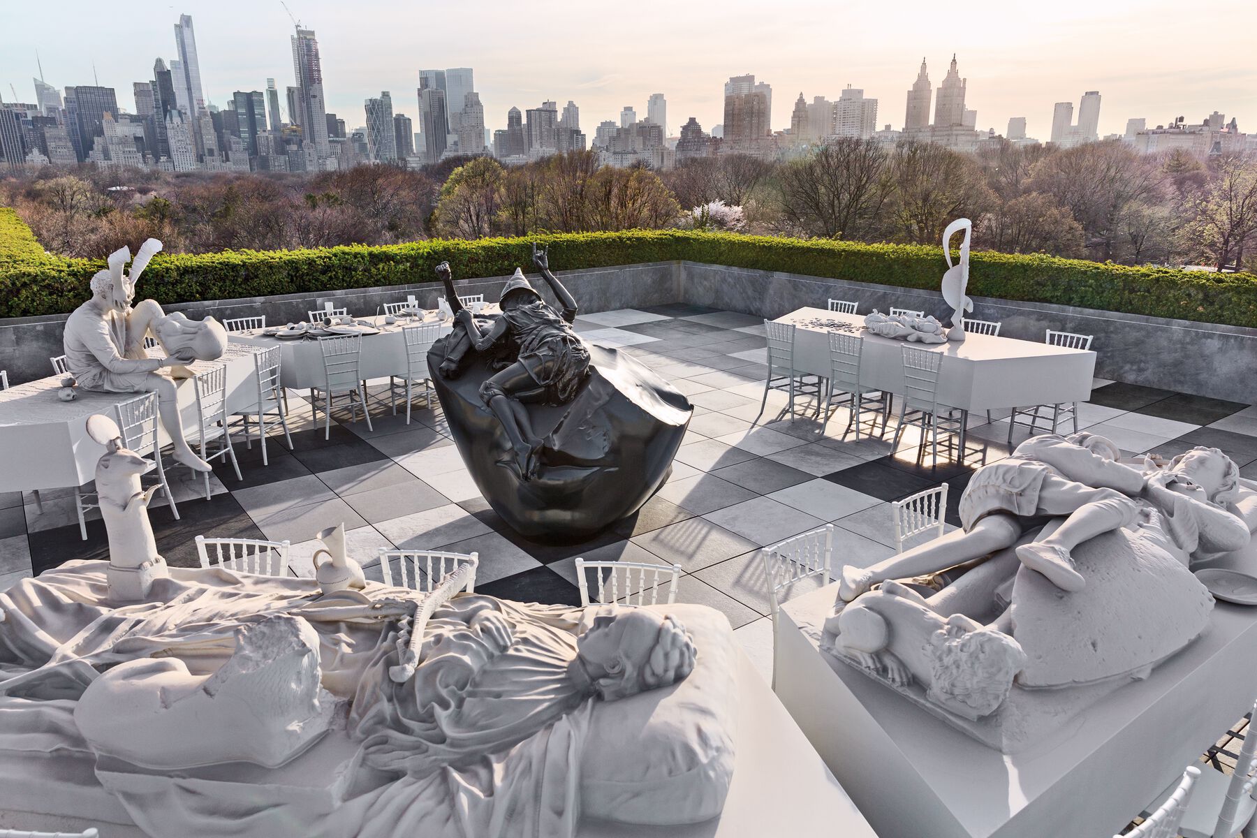A not-insignificant detail: the sculptures presented at the Met no longer respond to the artisanal and suicidal logic. They are fully produced by a robot and made of materials such as nylon and polyurethane: highly resistant and durable plastics. We flip the poles of the temporal paradox that was laid out in the “suicidal” phase, and which very broadly consisted of representing the present and the distant future using techniques from the past and perishable materials. Here, humanity’s distant past, thematically reactivated with these pieces, is approached technically using tools from the future and ultra-resistant materials, in processes where the intervention of the human hand has virtually disappeared. Compared to earlier periods in my practice, and even more so with the objects chosen from the collection, we are dealing with an “art” that can well correspond to a phase characterized by a “superfluous humanity”: replacing muscle, nerve, and brain with artificial intelligence. As such, the project as system to absorb the environment takes another step forward, risking a certain poetic hypothesis about the future that, not coincidentally, is unfolding on the museum rooftop.