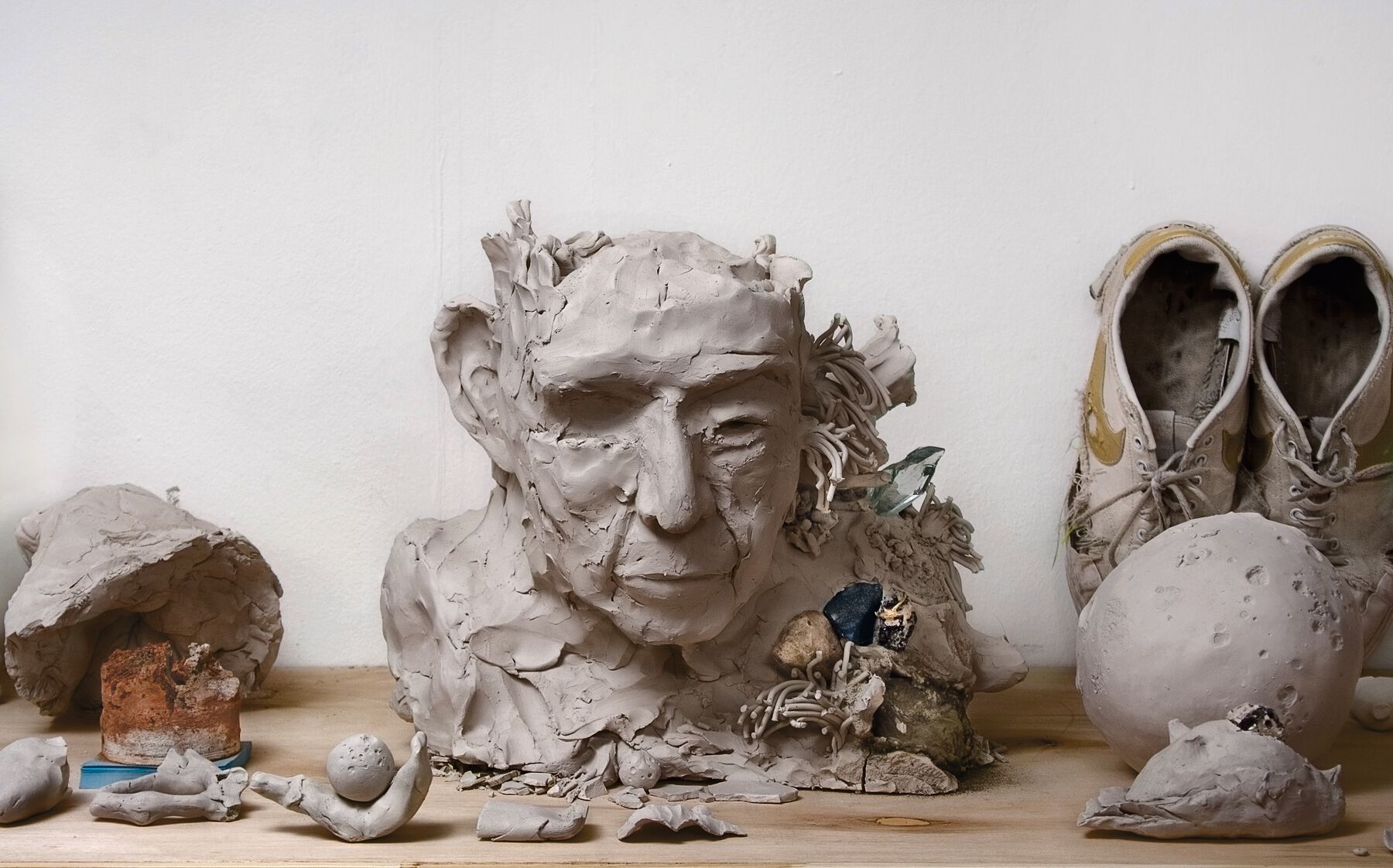 Like the condensers that Nikola Tesla conceived to transform the electromagnetic waves that surround us into instant energy, these humble raw clay Daseins were hypersensitive to time. They absorbed it from every particle that came into contact with them, accumulating and amplifying it. They magnified it thousands of times, as if under a microscope lens: that lens was their very body, which cracked and aged in just a few hours until it was transformed into a fossil, before disintegrating and vanishing. For me, then, clay represented the possibility to fossilize beings, whether figurative, abstract, or symbolic. There was one step between this discovery and playing with the oxymoron: the future (incarnated in a cyborg, in a device for the digital era or however our imagination represents the future) can be fossilized until it becomes a cemetery of what is to come. And at the same time, what is clay but the prehistory of life on Earth, organic matter pounded into infinity, the sediment of everything that has lived on its cool shores or beneath the surface of its waters? The remote past and the distant future draw closer to the present, and the present distances itself with them or opens up to its othernesses (to the multiverse, to its parallel dimensions). With clay, time becomes manipulable. Time becomes sculpture. And sculptures become suicidal.