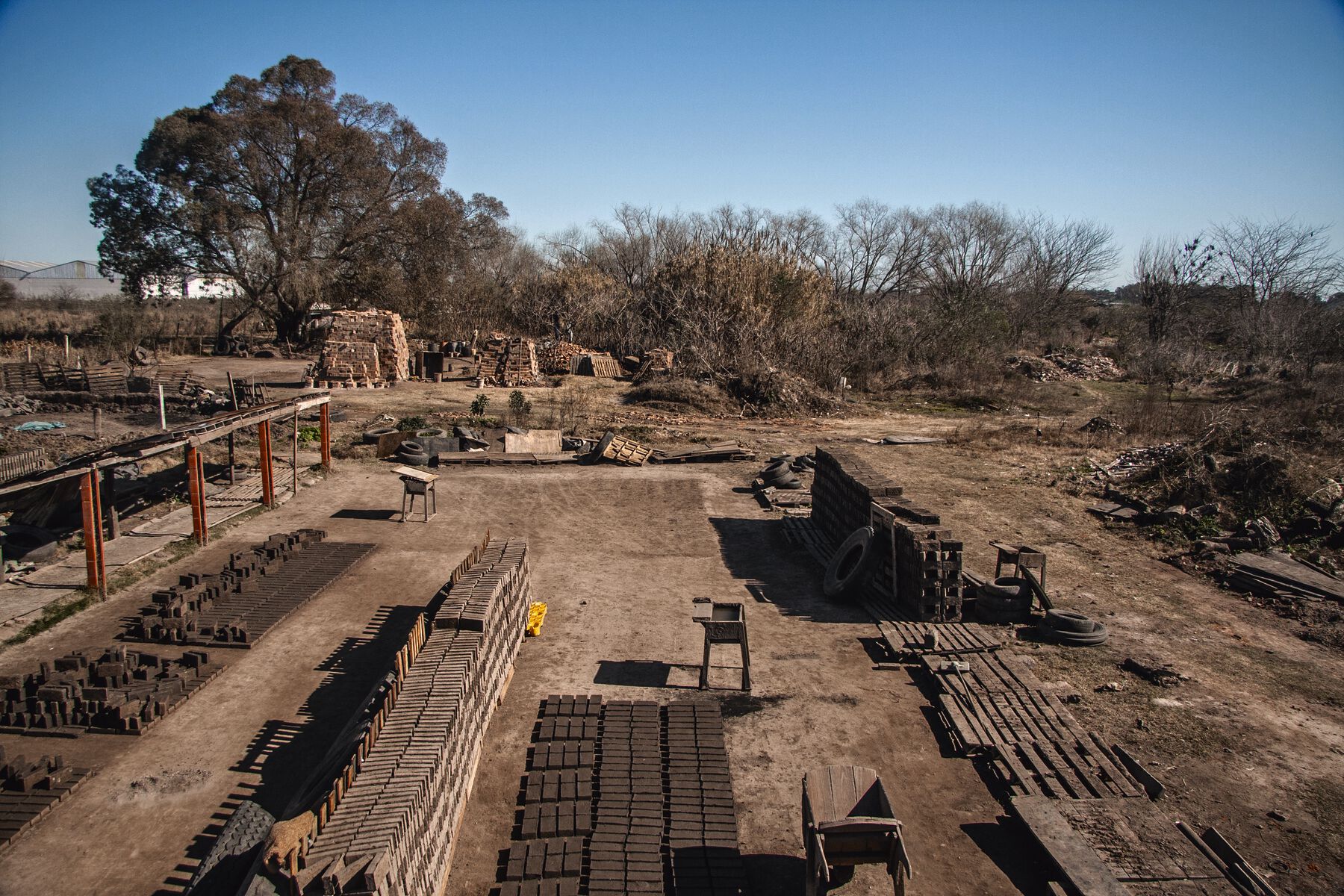 It also leads to an encounter with a species of synanthropic (highly adaptable to human environments) bird and its peculiar architecture: the hornero bird, a national symbol, and its nest, which resembles a traditional domestic mud oven used to bake bread in rural Argentina (fig. 0.8). I discovered that this bird, the brickworks, and my team all share the same material as object of transformation: soil. Each has their own methods and techniques to manipulate it, shape it, and stabilize it, but all have the same goal: to build with mud. In one case, cow intestines bought from local slaughterhouses are dumped into a giant hole filled with dirt and water, where a herd of horses trample it all until the mix is blended to make adobe (mud blended with the dung from those intestines), which is then dried in rectangular molds and fired in pyramids made of those same raw bricks (fig. 0.9). In the other, the adobe is fashioned by making a ball in the beak, blending saliva with bits of straw, branches, and grasses gathered in the area as the ovaloid walls of the nest are erected. And in the third, mud is blended with cement, wooden structures, screen, and wire.