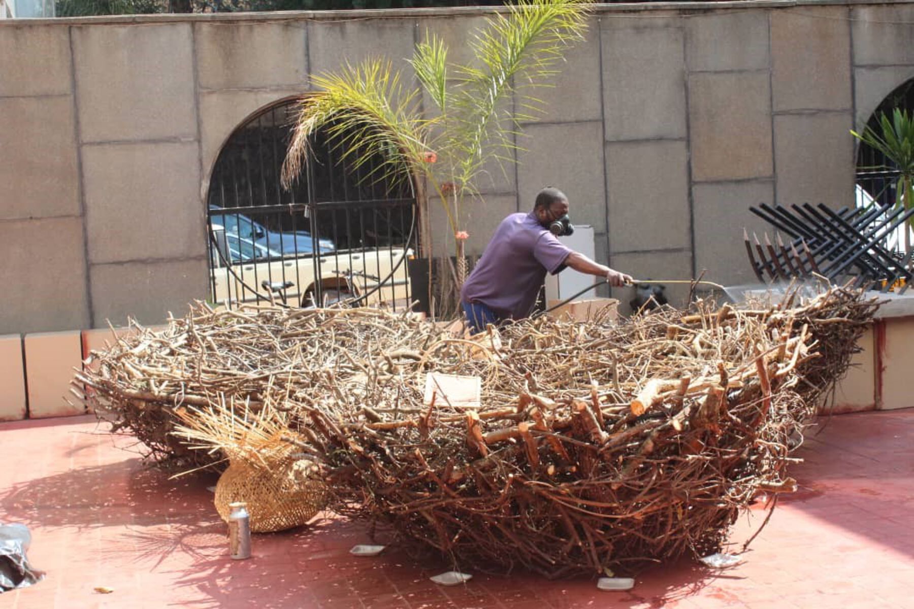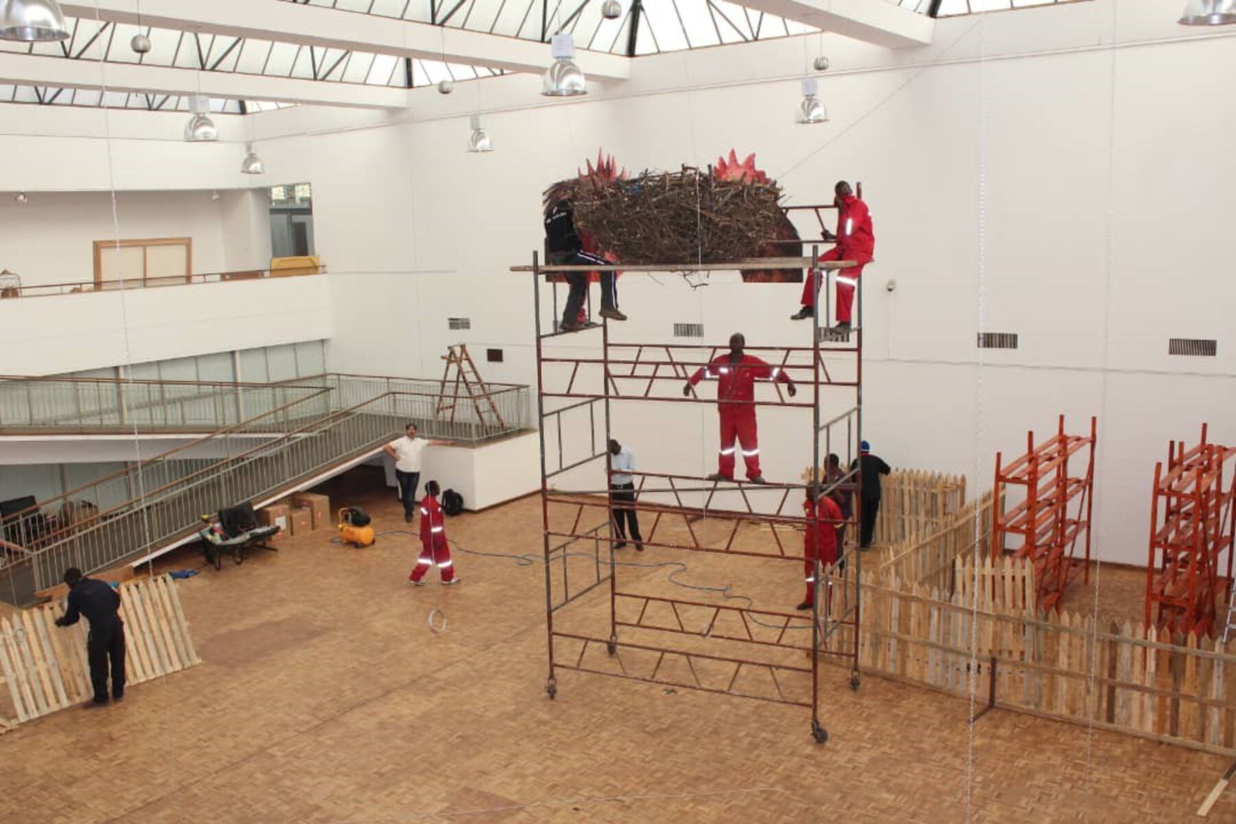 The exhibition team for the 2016 show Planetary Community Chicken was made up of Koen Vanmechelen and his exhibition crew from Belgium; Chido Govera, a Zimbabwean entrepreneur specializing in mushroom and poultry farming; Raphael Chikukwa, the exhibition’s curator; and gallery staff from the Conservation and Collections, Exhibitions, Workshop, Education, and Public Programming departments. Vanmechelen and Govera came up with the concept and provided the key resources, including the chickens and mushrooms. The role of Conservation and Collections was to preserve the exhibited elements as well as other artworks in the gallery. Workshop provided equipment and crew for the installation. Vanmechelen’s crew and Exhibitions were responsible for designing the presentation and led the installation work. Education prepared learning materials, and Public Programming publicized the exhibition to the media, corporate and other sponsors, and the public.