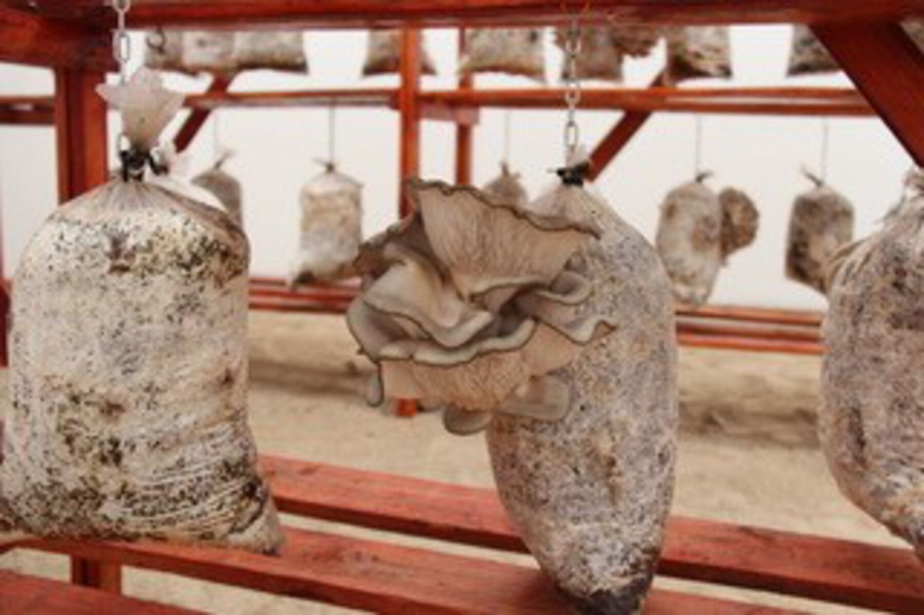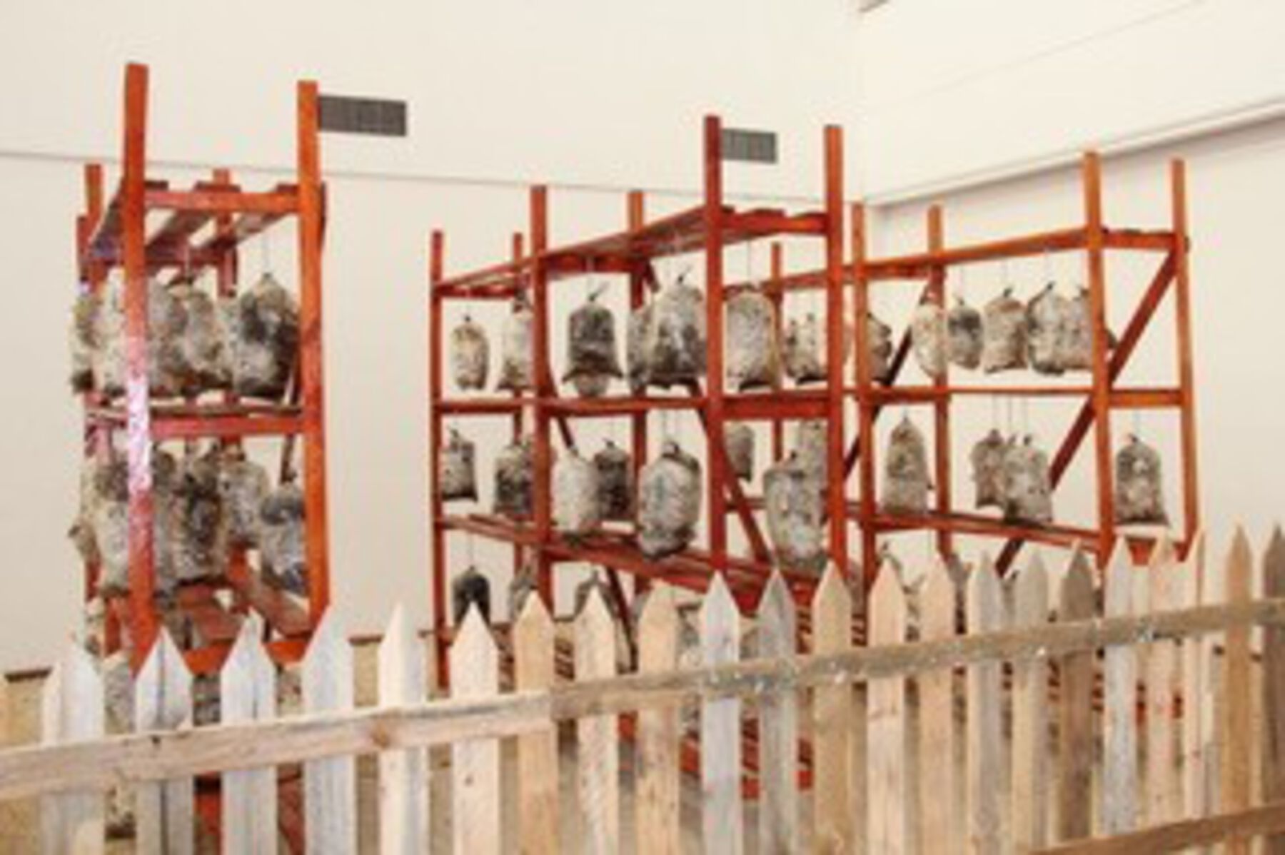 According to Govera, mushroom production is an indoor activity requiring an environment with sufficient humidity and air flow. She stated that the creation of this environment in the gallery was an interpretation of science in the form of art. The exhibition team provided shelves for the mushrooms and sand on the ground to maintain the required humidity. The mushrooms were kept fresh by watering them in the morning and evening throughout the duration of the exhibition. Mature mushrooms were harvested, and pieces of mushroom that fell to the ground were removed to keep the environment clean.