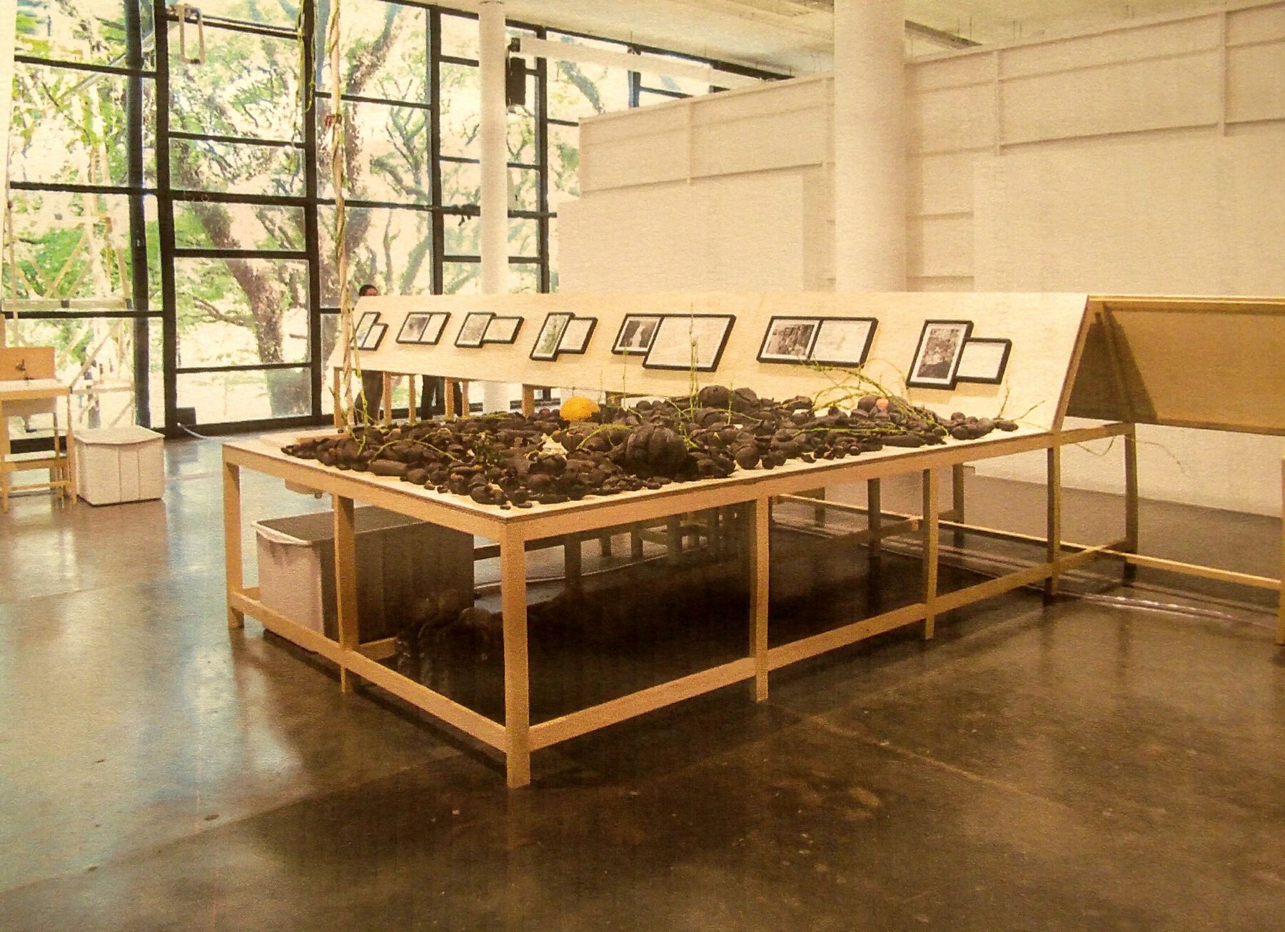 POSTA has been shown in five exhibitions to date: Lección de cosas (Lesson of Things), curated by Renata Marquez at the Museu de Arte da Pampulha, Minas Gerais, Brazil (2012); A Iminência das poéticas (The Imminence of Poetics), curated by Luis Péres-Oramas, 30th Bienal de São Paulo (2012, fig. 9.1); Palácio das Artes, Belo Horizonte, Brazil (2013); Centro Cultural Chacao, Caracas, Venezuela (2013); and Lección de cosas, curated by Andrea Elera and Jorge Villacorta Chávez at Sala Luis Miró Quesada Garland, Lima (2018, fig. 9.2). At all of these locations, the work was mounted following a script, which consisted of the artist selecting fruits and vegetables from local markets, having assistants encase them in clay, and arranging the wrapped vegetables on a table designed by the artist. Although the same procedure was followed each time, the vegetables naturally had different reactions and behaviors of expansion, retraction, and stabilization. These movements, some anticipated and others not, added symbolic meanings.