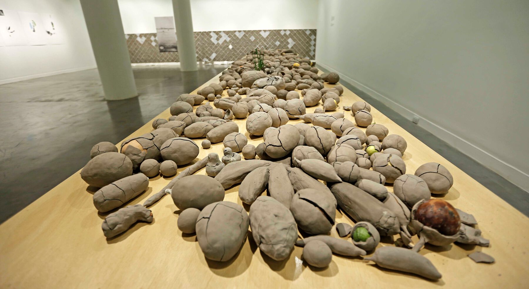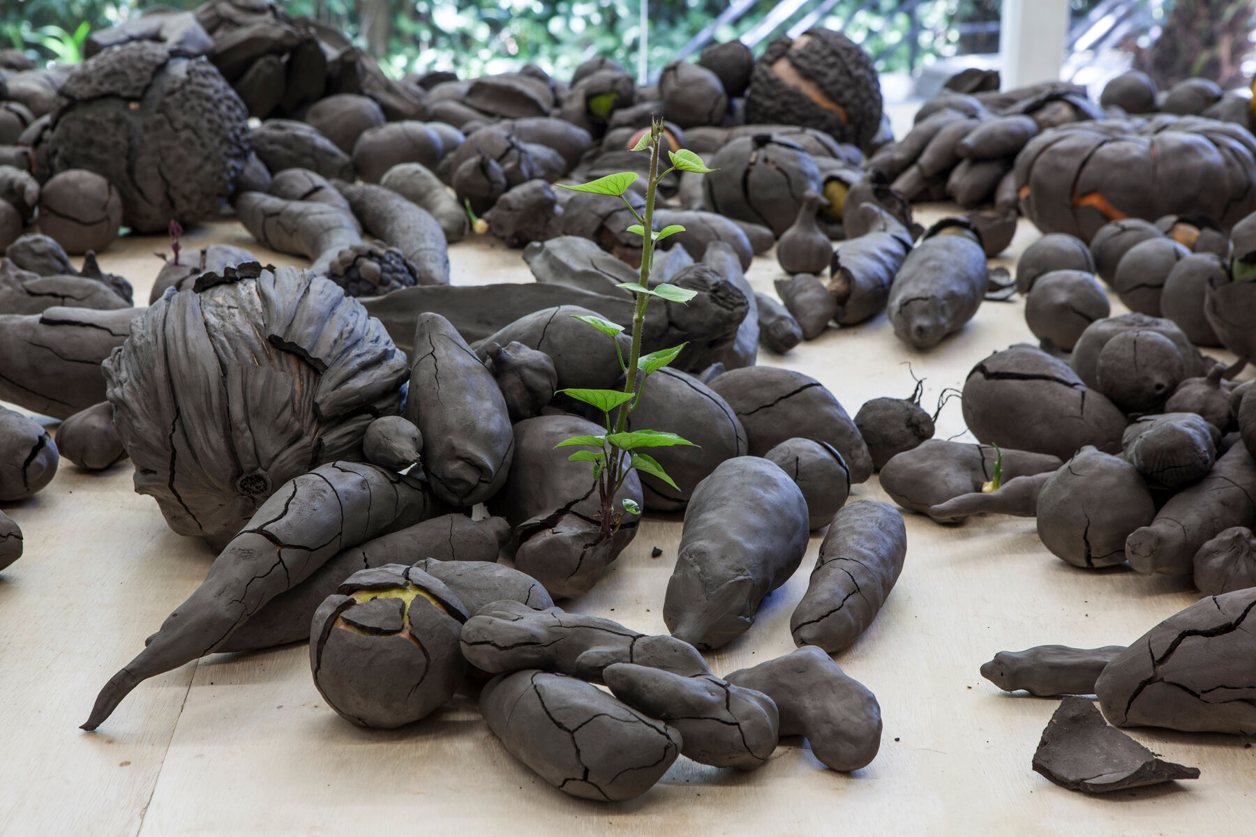 Nydia Negromonte (b. 1965) is a visual artist born in Lima and presently living in Brazil. She graduated from the School of Fine Arts of the Universidade Federal de Minas Gerais with a specialization in graphic arts and has participated in numerous exhibitions in Brazil and abroad. Some of the artist’s installations illustrate the idea of exploring, participating in, and collaborating on changes affecting matter, as in the ongoing work POSTA, an art installation made from clay-enveloped fruits and vegetables arranged on a wooden table. Over time, the objects change: the fruits and vegetables either grow or wither, and the clay dries and cracks, revealing the temporality of the objects and the transformations that occur to them due to (favorable or unfavorable) characteristics in the environment. According to the artist, this work investigates the movements of “vigor and decay”: some of the objects sprout, others decompose, and yet others dry up.1 The curator and critic Jorge Villacorta Chávez has written about POSTA: