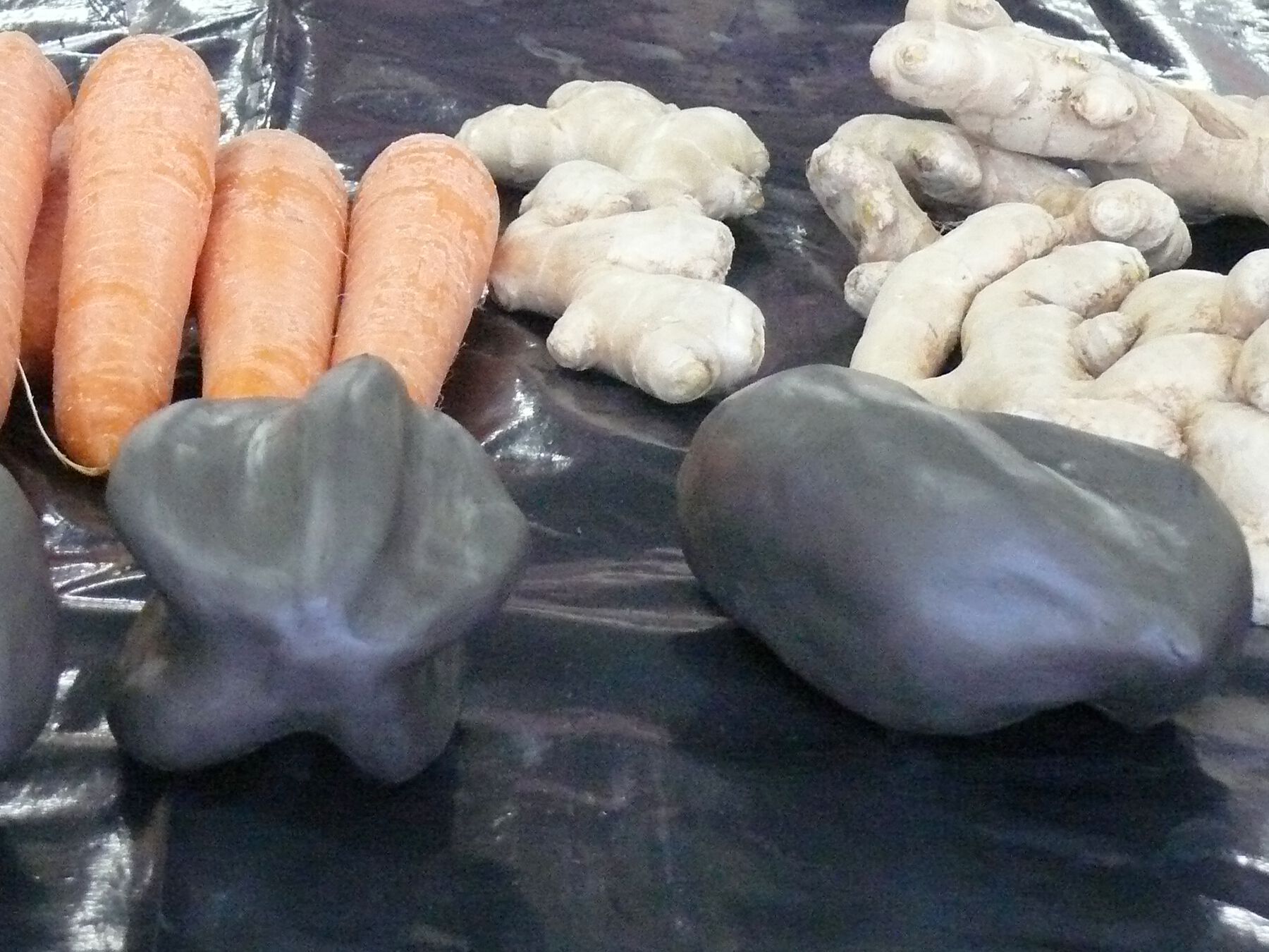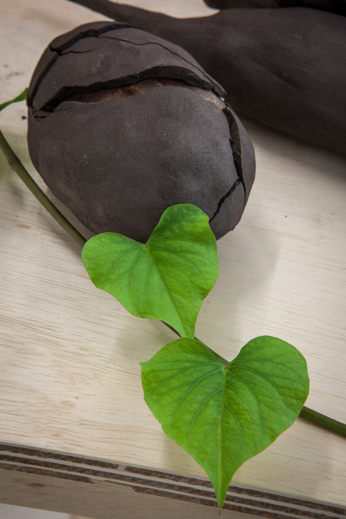The artist notes: “The most interesting thing about this work is that it invites observation. People spend a long time looking, trying to identify what something is, what it is not, if it is sprouting, if it is smelling. The banana, for example, smells not like rot, but like it is roasted, and it dehydrates, like a banana-raisin.” The installation requires replacement of selected materials so that the transformations happen according to the artist’s intention, although across the spectrum of transformations, some are expected and others are not expected, but accepted by the artist. The artist’s experience with the transformation of materials at each exhibition expands her understanding of the reaction of materials in different contexts. The vegetables that dehydrate and stabilize might even be used in another exhibition. And excess clay fragments that break during the germination process are removed to avoid unwanted noise.
