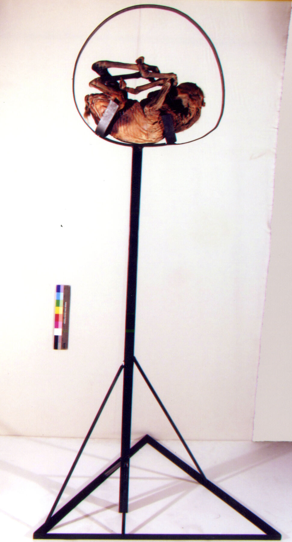 Two main condition issues were observed. Lavatio Corporis was in fact at that time mostly materially stable, but the fetuses were noted as having reduced density due to loss of bodily fluids, as well as desiccation and contraction of the tissues. There was also a loss of flexibility to the skin and resulting parchment-like texture caused by progressive desiccation and polymerization of the proteins structurally modified by the embalming process. The pedestals were neither original nor stable in supporting the fetuses. Additionally, the storage box was moldy and without any ventilation, such that mold continued to attack the fetuses.