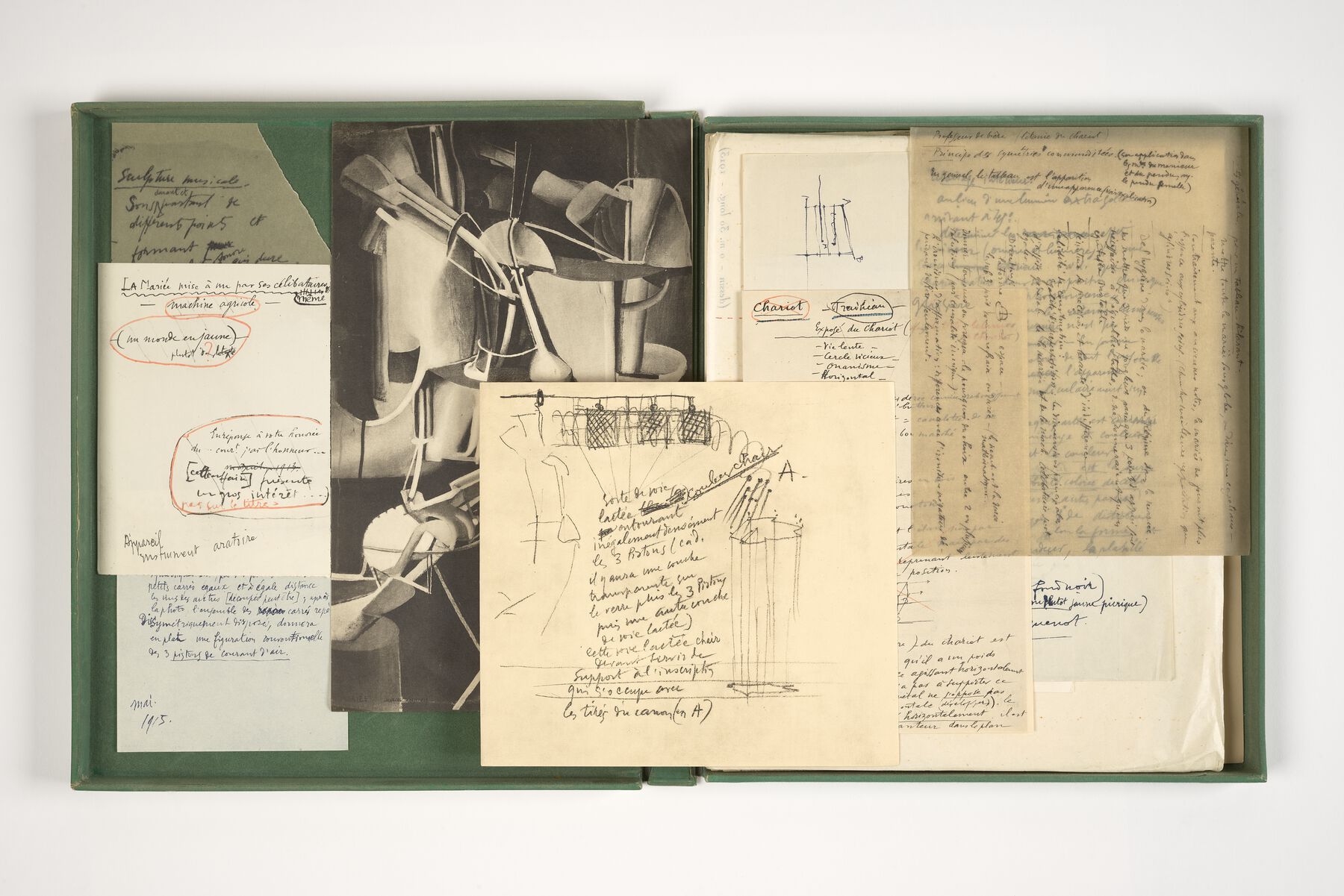 Signature characteristics of twentieth- and twenty-first-century art include such intricately interwoven presentations of texts and images, for which, it should be stressed, reading is often crucial. A touchstone of the genre is Marcel Duchamp’s Green Box (1934, fig. 11.1), filled with quasi-archival documents that present an explication of his Large Glass (1915–23). Like Duchamp’s Boîte-en-valise (Box in a Suitcase), produced in multiple editions as a box or valise that presents miniatures of his works, the Green Box requires firsthand access to touch and to read. This becomes difficult when these are designated masterpieces—significant works by a major artist. In Mexico City on the last day of the “Living Matter” conference, attendees viewed works by Duchamp, including the Green Box, in glass cases at Museo Jumex as part of the exhibition Appearance Stripped Bare (). The boxes were shown in galleries together with works by Jeff Koons, and the juxtaposition was telling. The exhibition presented Duchamp’s boxes in a state of embalmed inaccessibility, like closed books. The implicit denial that they are made to be unpacked, handled, and read took away their aura and retracted their power. Meanwhile, Koons’s brightly colored paintings and shiny sculptures grabbed visitors’ immediate attention. Duchamp smiled wisely and somehow knowingly out from the vintage photographs and film in the show.