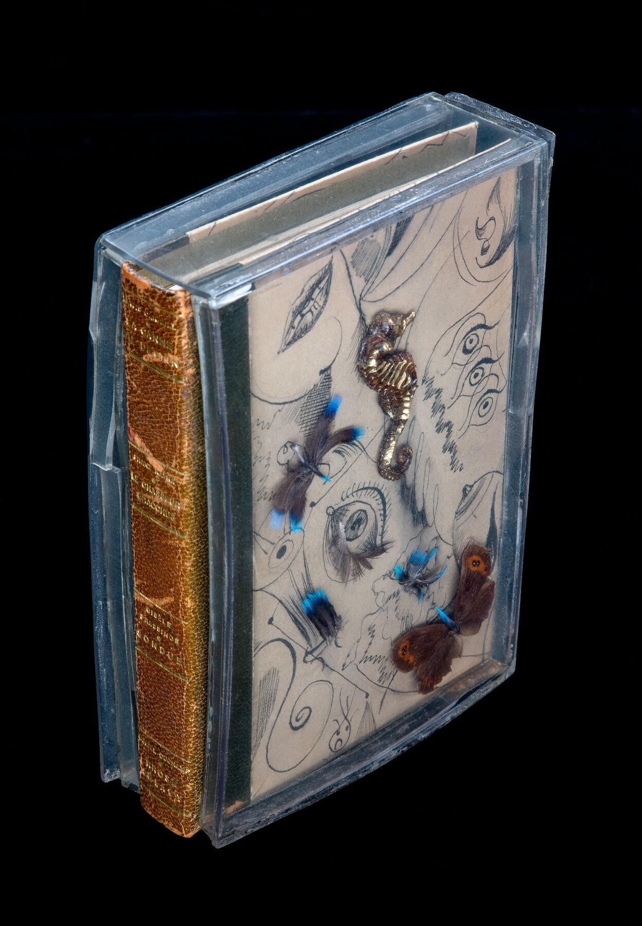 By the mid-1980s, when the GRI acquired the Jean Brown Collection, the acrylic case was yellowed and warped, partly split at the seams. The gilded seahorses, butterflies, and feathers were desiccating. This hauntingly beautiful and truly surreal book-object, evoking a dreamlike otherworld and the perfect enclosure for its fantastical literary works, has been exhibited once as of this writing, in the 1994 Getty Research Institute exhibition Sites of Surrealist Collaboration. It was displayed in a wall vitrine with a black velvet curtain to protect it from sustained direct light.