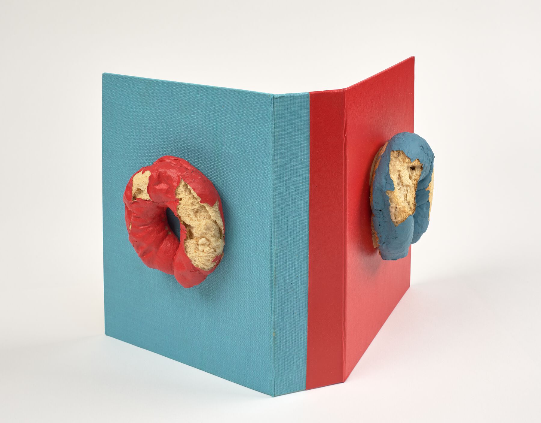Jean Brown was fascinated by the works of Dieter Roth and acquired more than fifty volumes directly from him. She particularly appreciated Roth’s experiments with book design and publishing formats, such as his combination of traditional printing techniques with contemporary materials that are far more unstable than the papers that bookmakers used for centuries. Brown had at least two copies of the special edition of Roth’s Bok 3c: Wiederkonstruktion des Buches aus dem Verlag Forlag Ed (1961/1971, fig. 11.4) which has a separate slipcover embellished by either painted bagels or a croissant. The GRI has bagels; the Museum of Modern Art, New York, has croissants (, 29). Here, the question is whether to restore the sections of the bagels that have crumbled. So far the bagels are slightly deteriorated, and the crumbs have been carefully preserved, somewhat sympathetically collected in a small bag; because of their fragility, the covers receive only supervised use.
