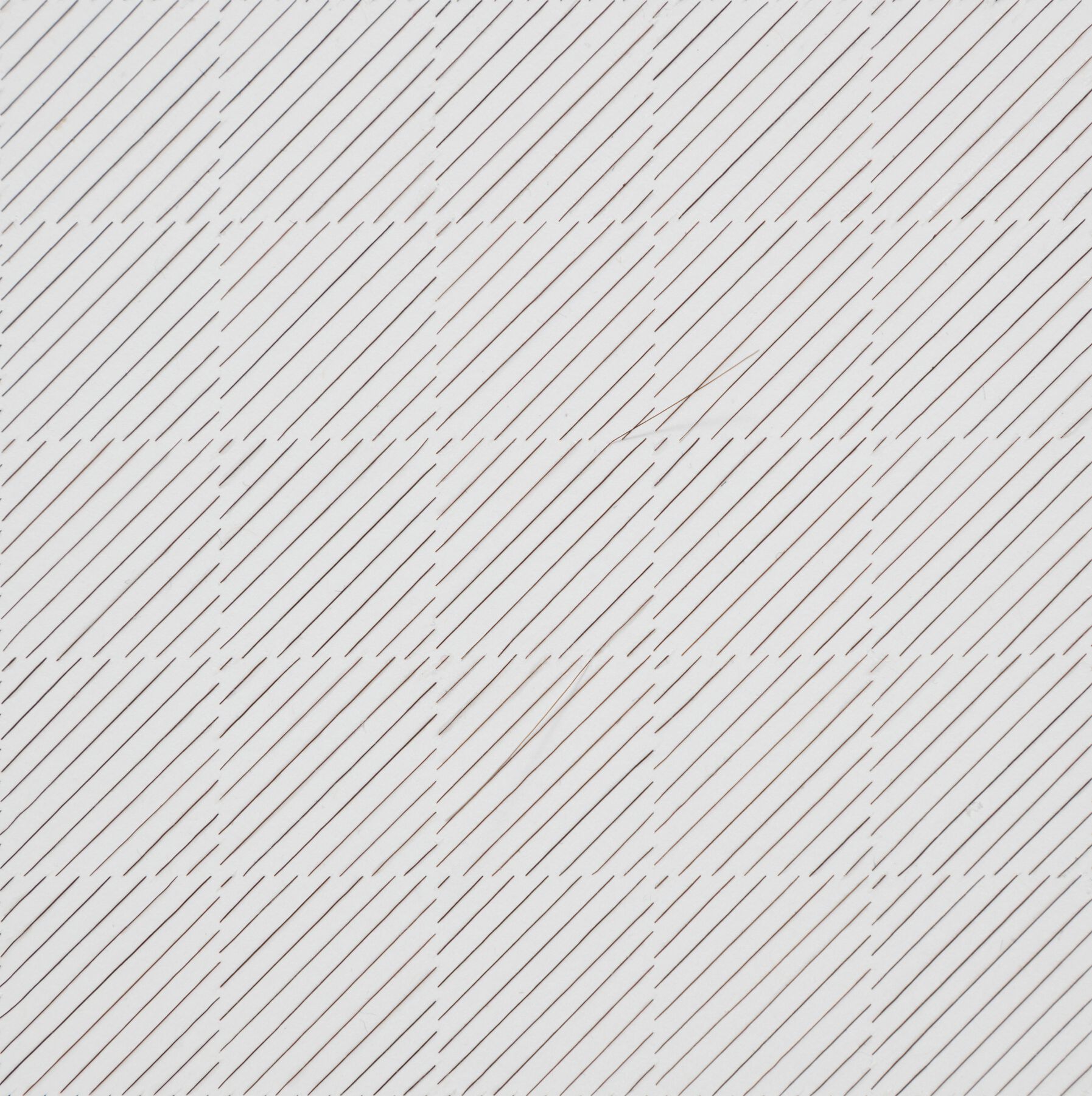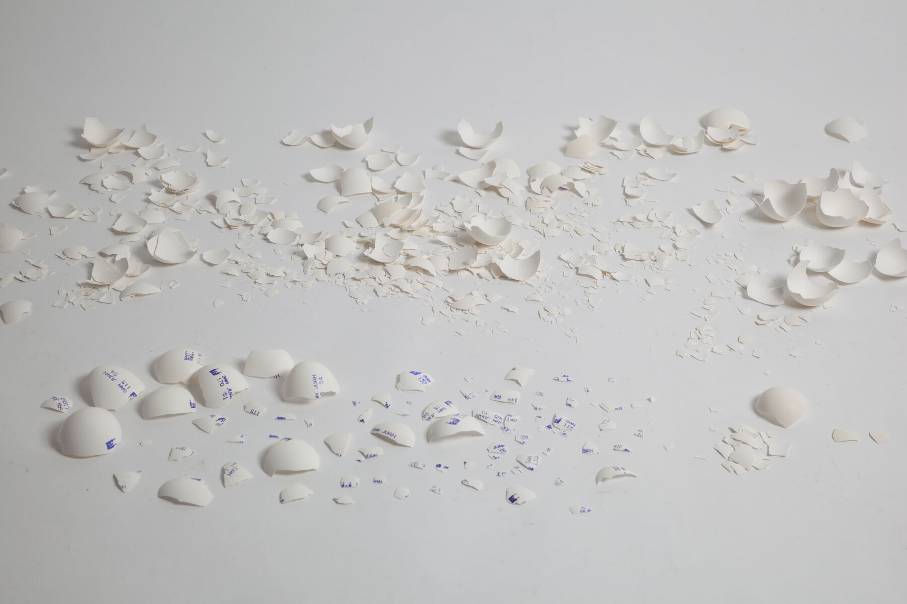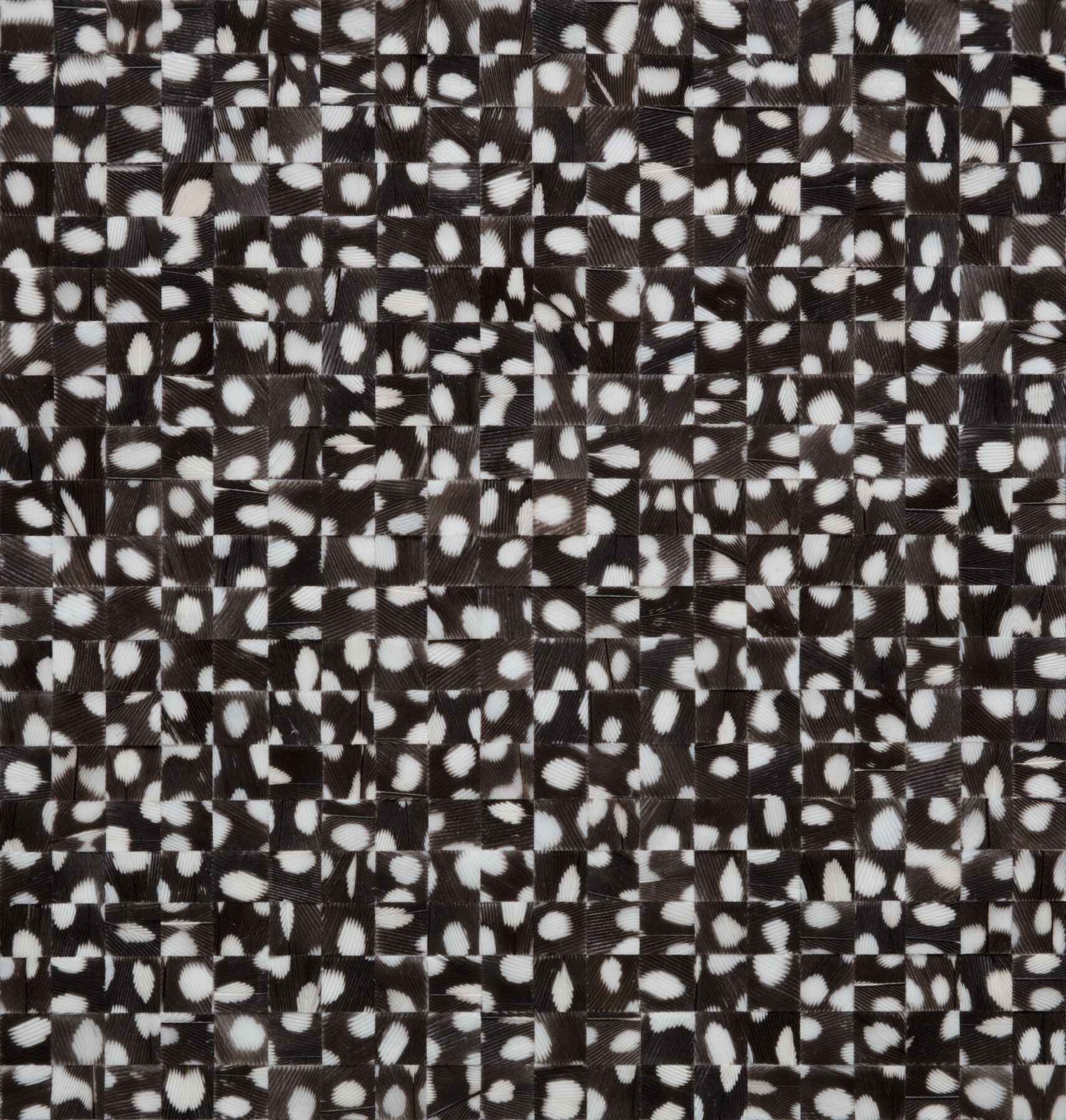 In my series of drawings on paper with human hair (2004–ongoing, fig. 22.7), although the hair is organic matter, it lasts a very long time as the container of a person’s energy. In the pieces with pigmented turkey feathers (fig. 22.8) and natural-colored feathers from various birds (fig. 22.9), I use acid-free materials, as suggested by conservators. To preserve the color, whether natural or artificial, I enclose them in museum glass, which protects the pieces from 99 percent of ultraviolet rays. If the works lose some color, they are still the same works, just aged over time, which I believe adds something special. The series made with eggshells, titled CaCO3, which I began in 2013 and continues to date, portrays my compulsion to reach degree zero in painting, which has led me to explore the medium itself outside of itself—that is, the idea of painting without painting. The entire surface, prepared with the same care as a canvas that will slowly disappear as it is impregnated with oil paint, will be covered with tiny pieces of this material. The eggshells, previously selected and catalogued by color, are broken up, counted, and placed on the surface so that no empty space is left and, at all costs, they never overlap (fig. 22.10). Control during the process is absolute; I keep a record of the time it takes to cover the entire surface and also how many pieces fit on it. This information provides the title.