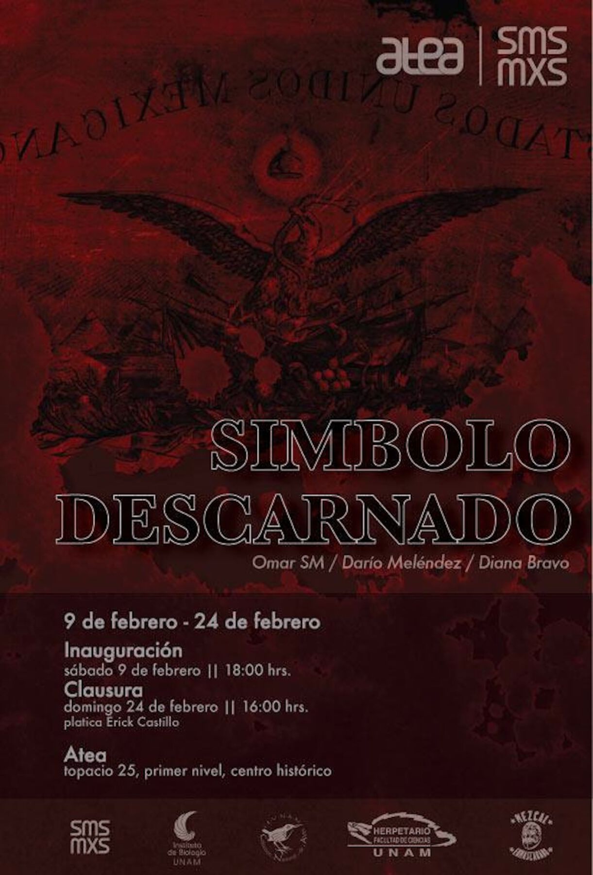 Símbolo descarnado was a collective installation exhibited from February 9 to 24, 2013, at ATEA in Mexico City (fig. 24.1).1 It consisted of an ephemeral mural of the national coat of arms, drawn with cochineal by Omar Soto; a sound spatialization by Diana Bravo based on amplified noises made by larvae; and the rotting carcasses of an eagle and a serpent inside a glass case, created by me, Darío Meléndez. The main intent was to present, in the white cube, the atmosphere of deterioration in which my country is submerged and to question the viewer through an experience of formlessness in contrast to the asepsis of the site. The strategy for delivering criticism of the eroding structure and validity of the Mexican state—symbolized by the eagle and serpent on the nation’s coat of arms—was to utilize the aesthetic, performative, and sonic possibilities of material and symbolic corruption through different approaches.