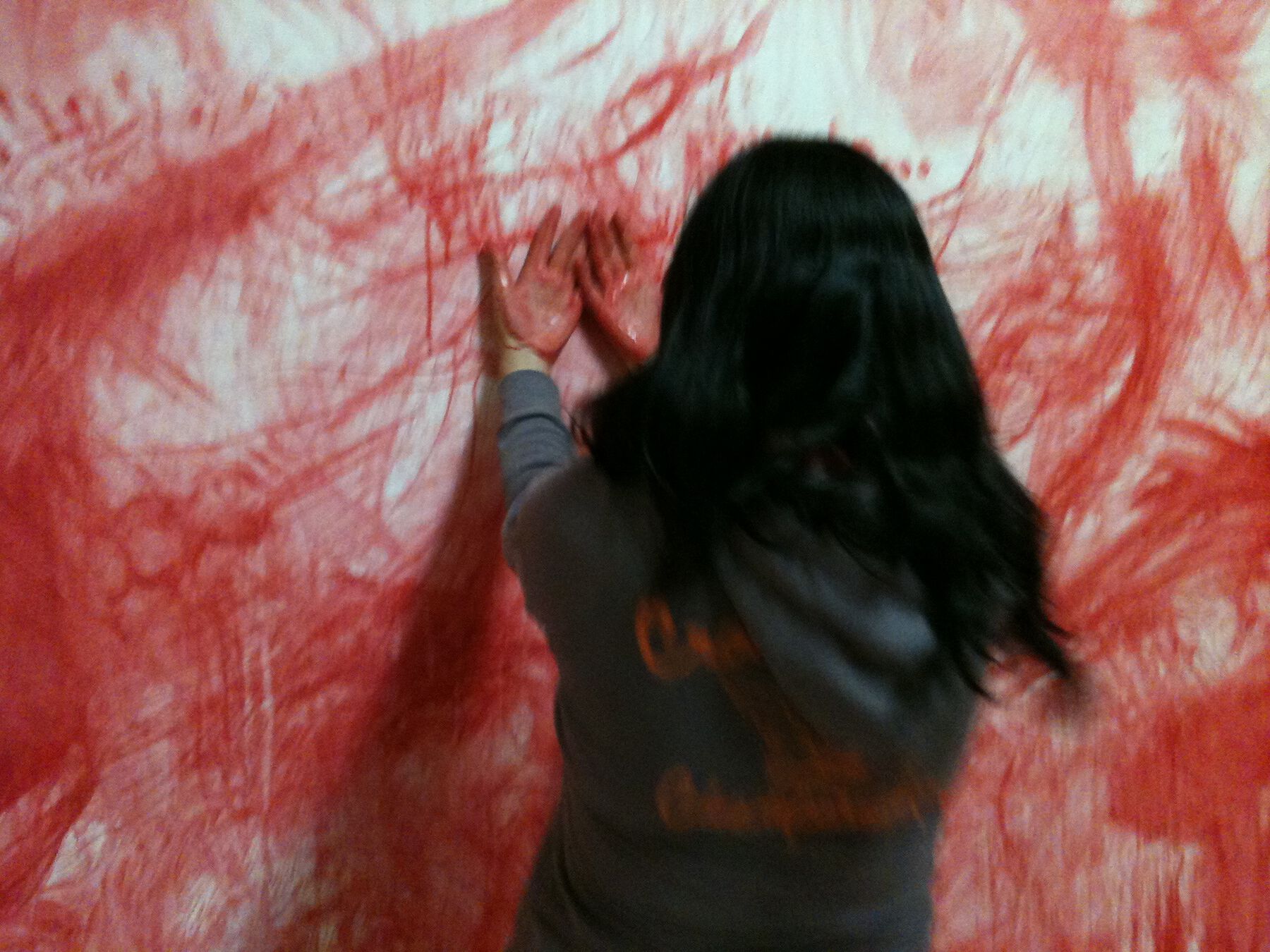 In Soto’s ephemeral work, the corruption consisted of those attending the opening using their hands to erase (redraw?) a mural based on a nineteenth-century lithograph of Mexico’s national coat of arms (fig. 24.2, fig. 24.3). In this way, the death of the state, present in its own foundational image, was deformed by the viewers themselves. In addition, because the mural had been made with cochineal, a reddish organic colorant with a heavy historical weight, the hands that blurred the image came away stained, evoking a criminal complicity. Instead of existing only as an intellectual dialogue with the viewer, this drawing sought to involve the bodies of the attending public. Having a collective participate in this piece demonstrated that the ideals of our nation were devoured when they took the form of institutions and political figures.