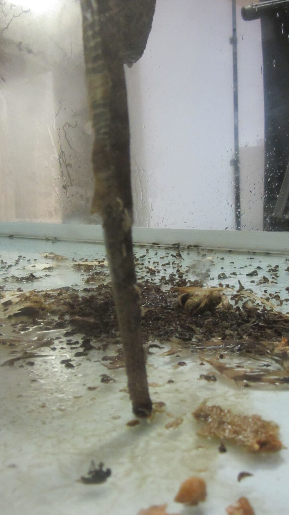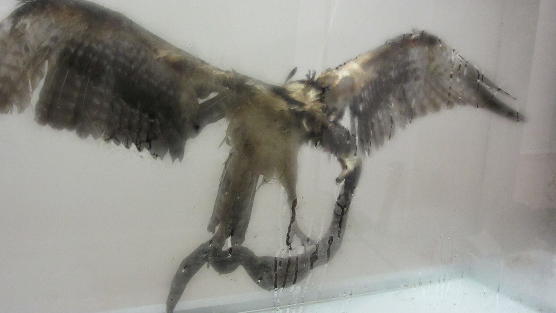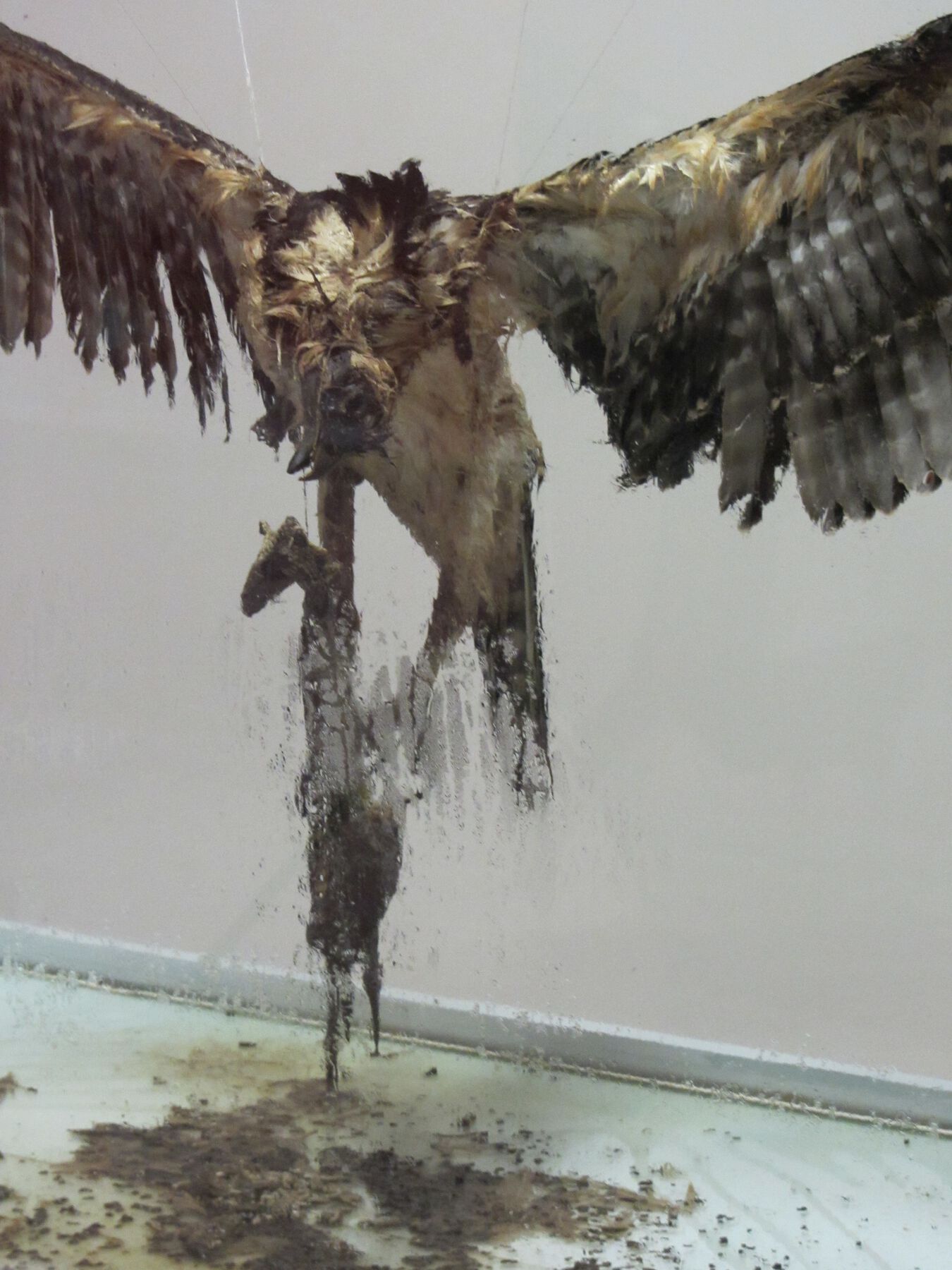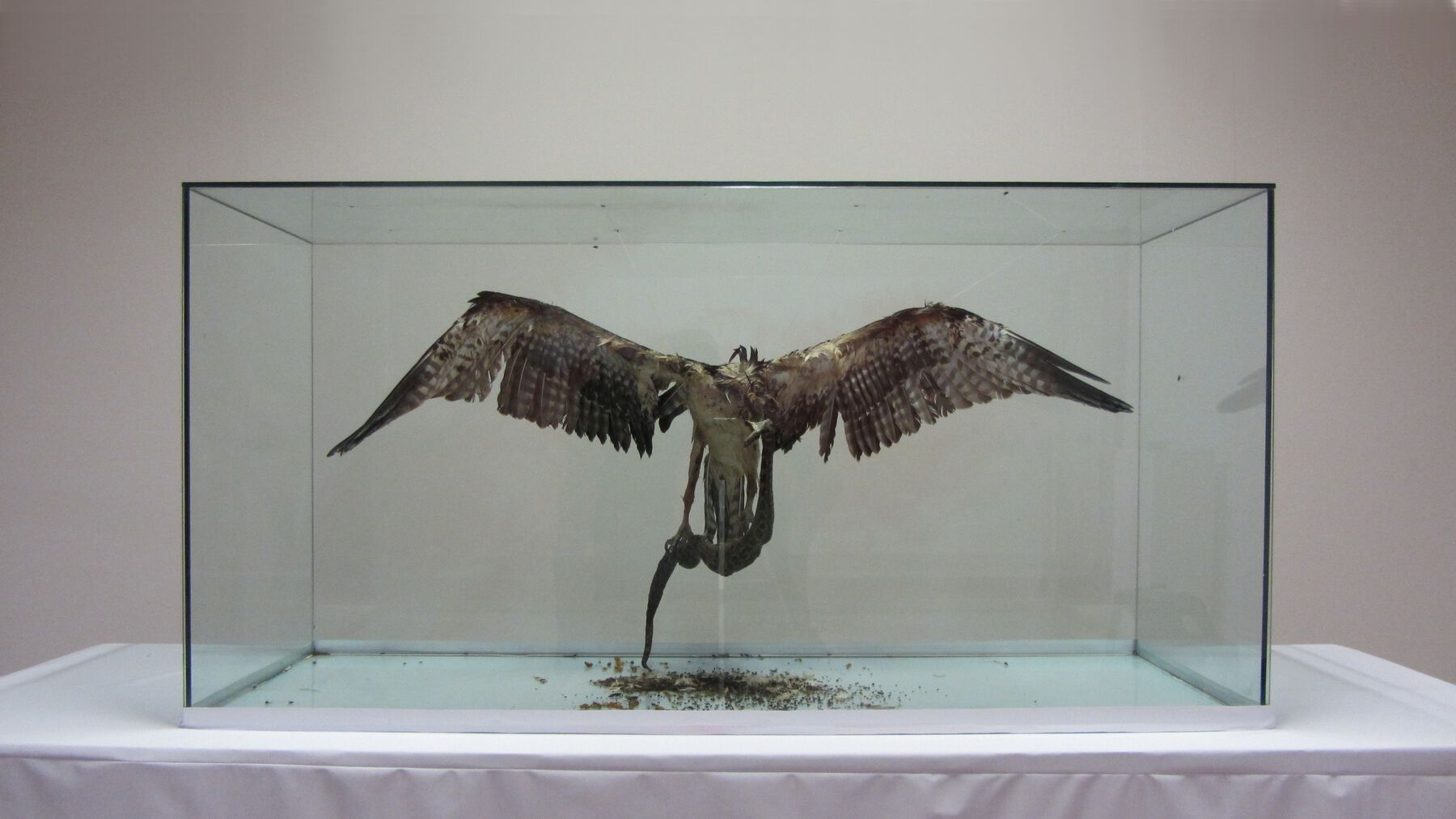 The last part of the installation was a partially sealed glass case containing the carcasses of an eagle and a serpent in suspension, like a monstrous apparition (fig. 24.5, fig. 24.6, fig. 24.7, fig. 24.8, fig. 24.9). Both were rotting, and they were clearly alluding to the nation’s coat of arms. As in the other cases, corruption of the symbol was the essential agent of the piece, but in this case the deterioration was real. In counterpoint to the idea of representation in the recording and amplification of the sound of the larvae in Bravo’s contribution, and in the participatory drawing and erasing of Soto’s mural, this part included the presence of the actual symbol in and of itself deteriorating. This situation gave the installation greater corporeality—and another unforeseen factor that enriched the initial idea, namely the smell of death. Thus, the intention of evoking the atmosphere of corruption of the site from which the piece was submitted, Mexico City, appeared to be complete.