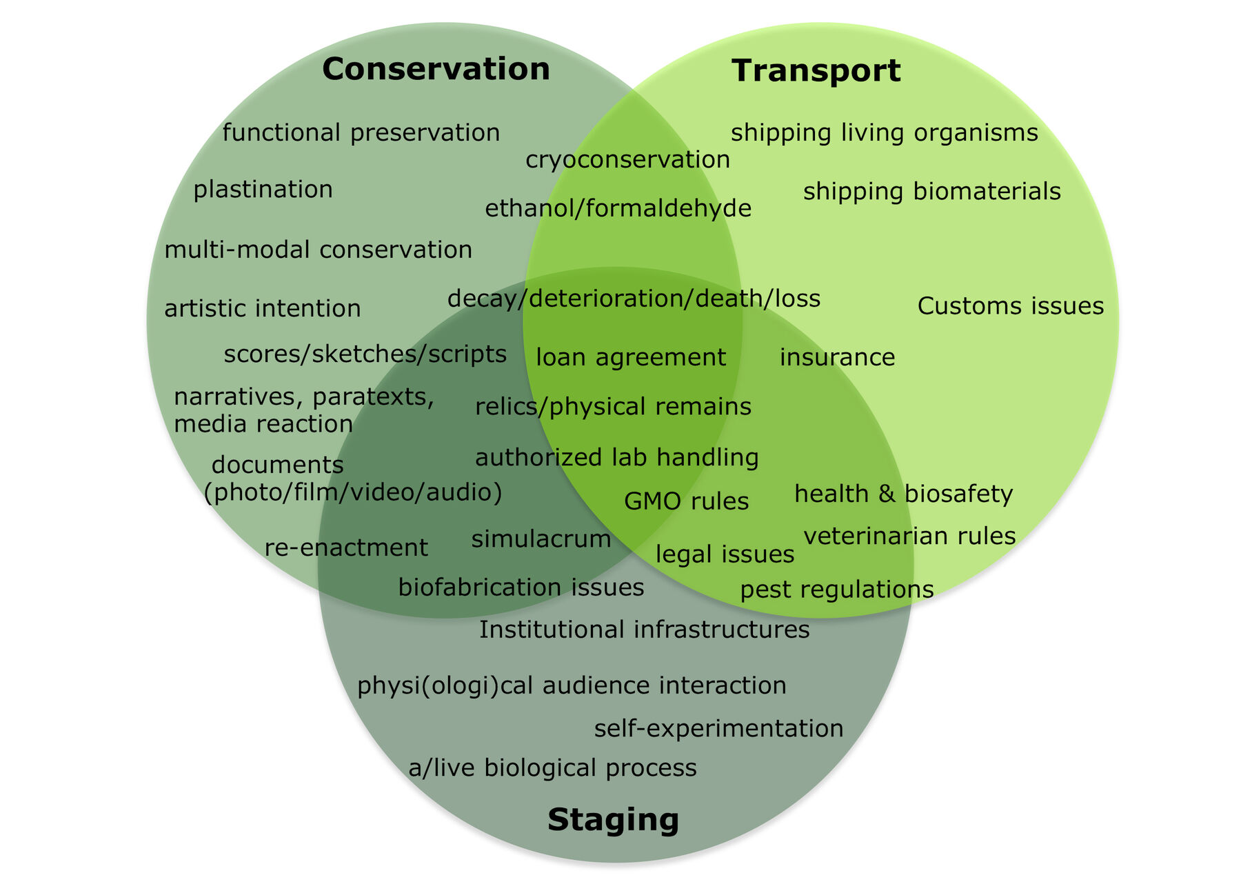 Devoid of institutional advocacy, the third category lacks any coordinated methodology, since these practices cut across many disciplines, from art to natural history, medical and design museums, media art and performance festivals, biotechnology and bioethics, and are still only supported by a few collectors ready to engage with the subsequent challenges beyond conservable objects. Some of the challenges of biomedia art present similarities to those of performance art—especially as their actual presence may not only be reenacted but “survive” in the form of documents or physical remnants (). However, the various nonhuman and techno-scientific agencies of micro-performativity (; ) involved in such artworks destabilize human scales (both spatial and temporal) as the dominant plane of aesthetic experience and link together the machinic and the organic (). The shift from organic representation to biological manipulation results in technical, institutional, regulatory, legal, ethical, bureaucratic, philosophical, and aesthetic issues with regard to museum infrastructures, the status of living organisms, tissues, and genetically modified organisms (GMOs), and their fragility when maintaining, conserving, reenacting, or shipping them.