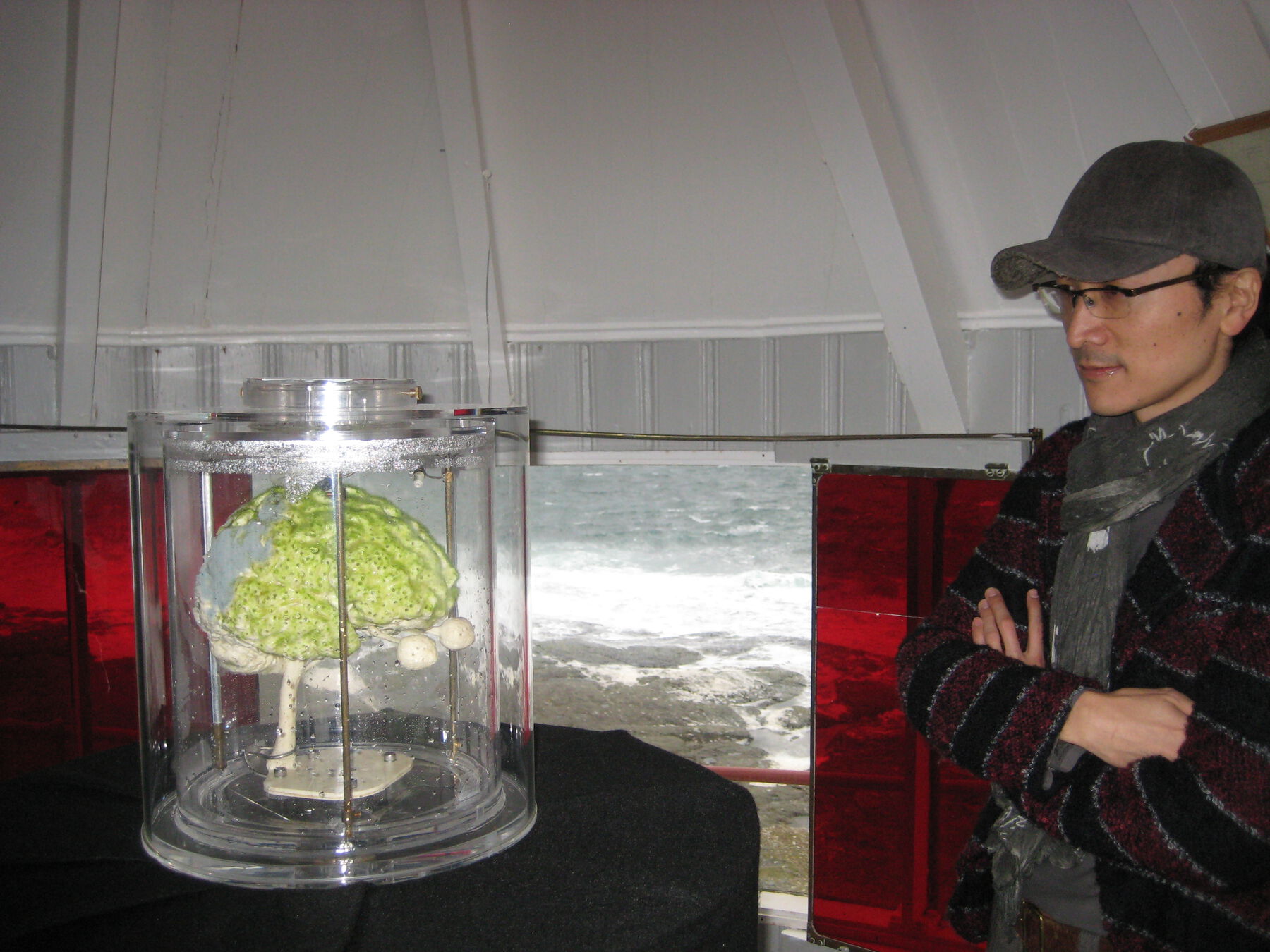 A few months later, however, a fully functional version of Light, only light made its debut as part of the Article Biennale in Stavanger, Norway (fig. 6.3).3 Here, the glowing brain sculpture was shown in the lantern room as the only form of illumination at a coastal lighthouse, where visitors were invited in to contemplate the stunning effect. This time, the organizers had decided to operate in a legal gray zone by displaying Light, only light “in transit.” A permit for contained use of genetically modified plants was obtained with the condition that the transgenic moss, after having been sent from Leeds to a laboratory in Uppsala/Sweden and driven over the border by the artist himself, would be autoclaved at a laboratory at the University of Stavanger.