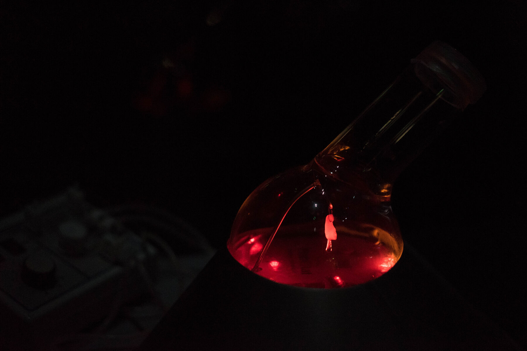 An exemplary case of conservation of a complex synthetic biology-based work is Living Mirror (2013, fig. 6.8) by the artist duo C-Lab, which solves the challenge of optimizing a living biomedia piece so its function is preserved in potential perpetuity. Living Mirror uses magnetotactic bacteria’s ability to swim along the Earth’s magnetic field in order to create a living mirror image of the silhouette of its observer. Once an input image is translated into a magnetic field, the bacteria reorient their bodies in real time, causing light to scatter and create an image in a liquid bacteria culture. The piece draws on the myth of Narcissus, who fell in love with his own image in the water’s reflection, and at the same time emphasizes contemporary science’s discovery that human bodies are made up of a majority of nonhuman bacterial cells. The development of a collectible version in which this shimmer effect persists over time took several years—with bottles available for replacement in case of anomalies. Even if the bacteria die, whatever nanomagnetic chain they created would remain intact beyond their death.