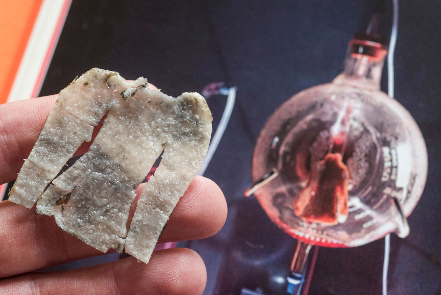 Another piece by the Tissue Culture & Art Project, Victimless Leather (2004), sparked headlines like “Murder at MoMA?” when the bioreactor growing miniature leather-like jackets out of immortalized animal and human cell lines had to be stopped due to unforeseen cell proliferation taking over the apparatus in MoMA’s Design and the Elastic Mind show (). While the art died a month into the exhibition, the institution turned the failure to stage the piece as intended into a popular selling narrative. Victimless Leather was indeed performed successfully just before and after the MoMA exhibition at sk-interfaces in Liverpool and Luxembourg. Here, the question of the “afterlife” of the grown biotechnological garments was debated between the artists and the curator, resulting in the decision to have the surviving cell cultures plastinated (fig. 6.5), but to keep them strictly for documentation purposes—neither exhibit them in place of the actual piece, nor sell them.