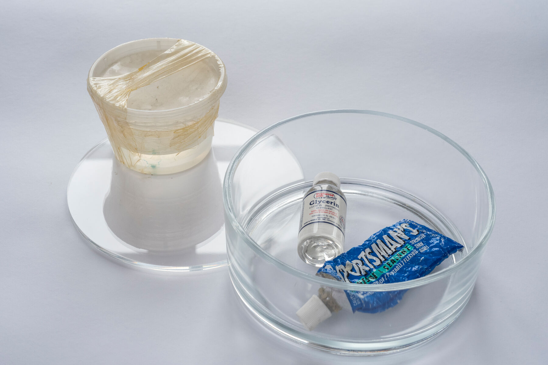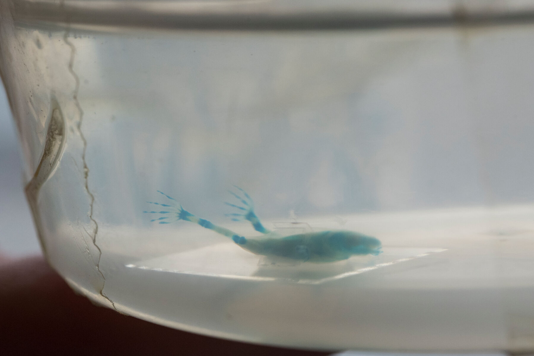 In contrast, artist Brandon Ballengée has found a way to both carry out bio-artistic research and preserve material outcomes that can be collected. In Species Reclamation via a Non-linear Genetic Timeline (1998–2006, fig. 6.6, fig. 6.7) he aims at phenotypically re-creating an extinct aquatic frog species using closely related extant species by resurfacing historically described physical traits, resulting in “living sculptures” (). They live their natural life span before being cleared and stained (a chemical process to reveal the animal’s skeletal anatomy consisting of bones and cartilage), photographed, and sold as prints or as conserved specimens, ready to be released into glycerin, where their translucent members seem to gracefully swim.